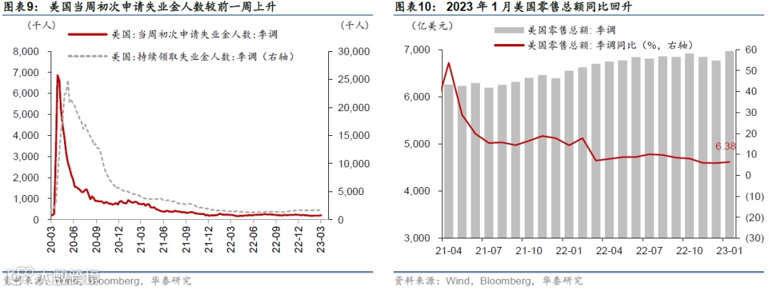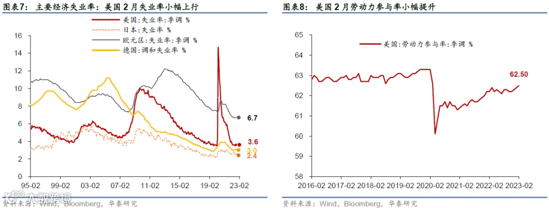 美国2月劳动参与率回升,小时工资增速放缓。2月美国劳动参与率回升0.1个百分点至62.5%,高于彭博一致预期的62.4%,失业率回升0.2个百分点至3.6%,小时工资环比下降0.1个百分点至0.2%,低于彭博一致预期的0.3%。劳动参与率回升与小时工资增速放缓反映美国就业供需均有回升,与近期首次申领失业金人数的超预期回升以及1月岗位空缺高位回落的趋势一致。但非农职位空缺人数与待业人口之比仍高企,在美国劳动市场仍然紧张的情况下,工资增速能否维持放缓趋势存在不确定性。