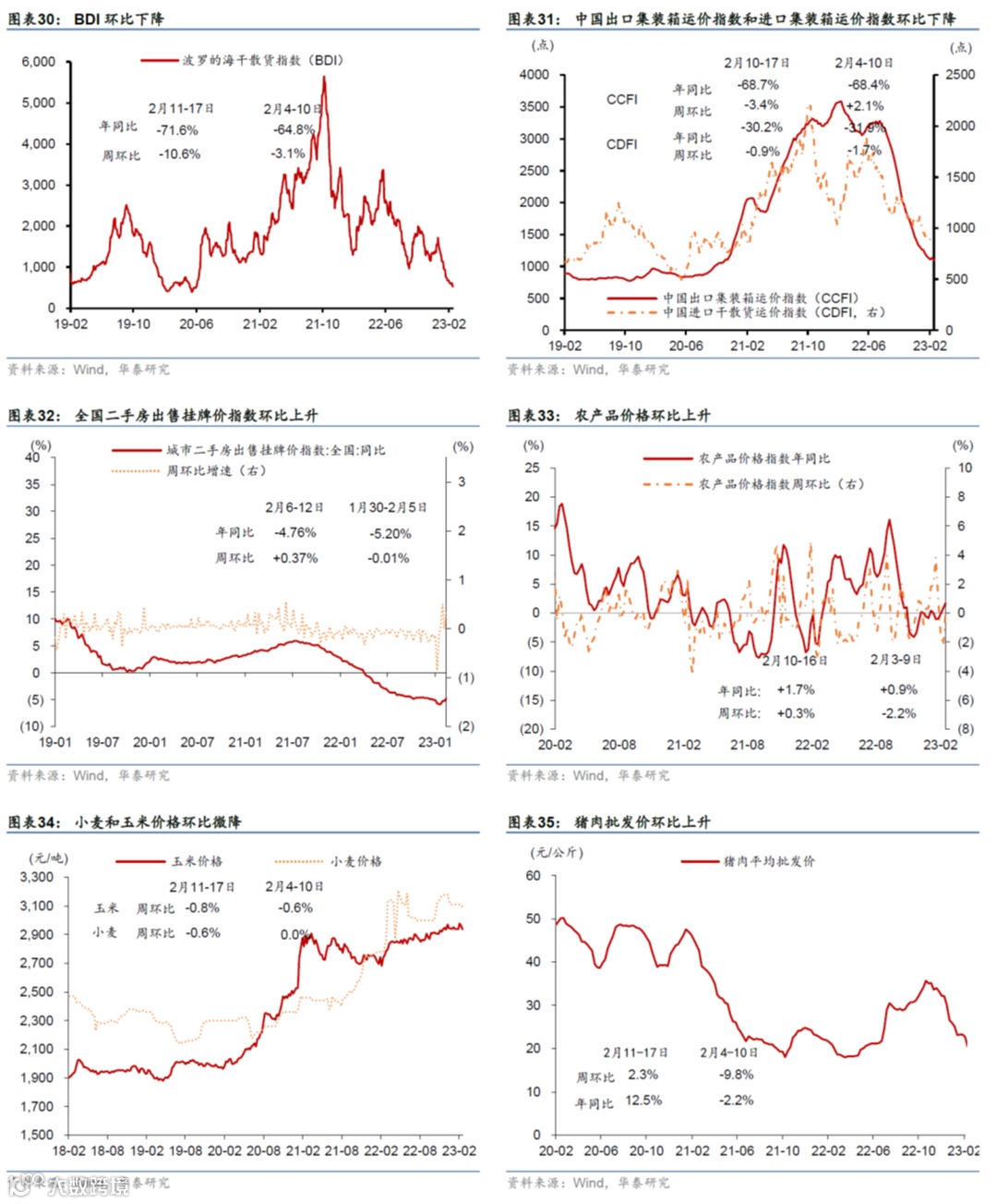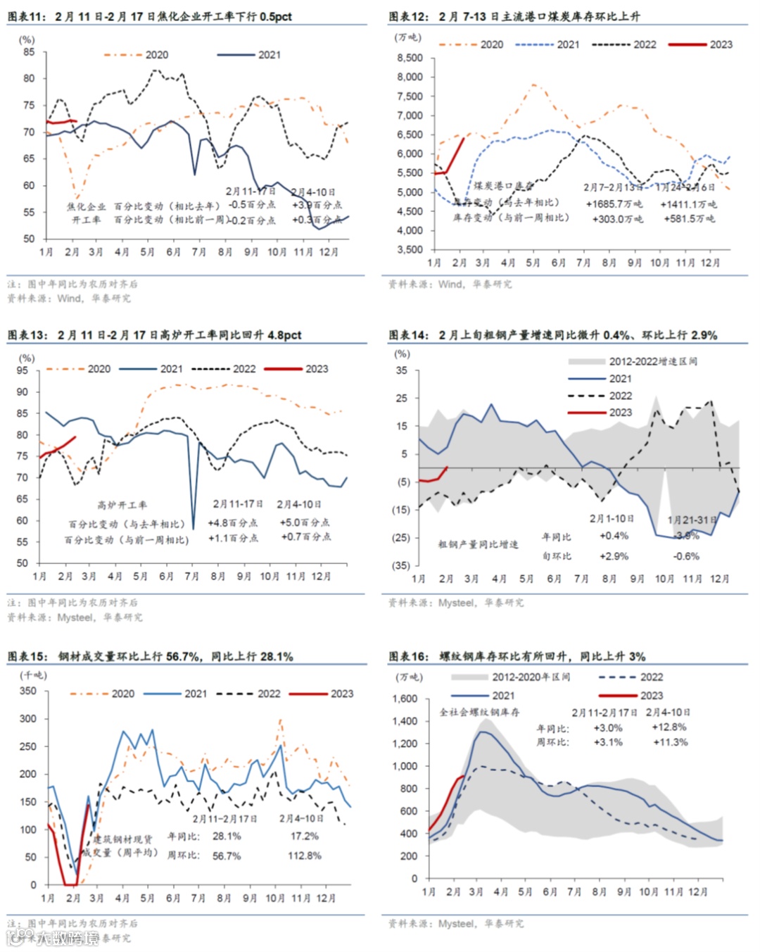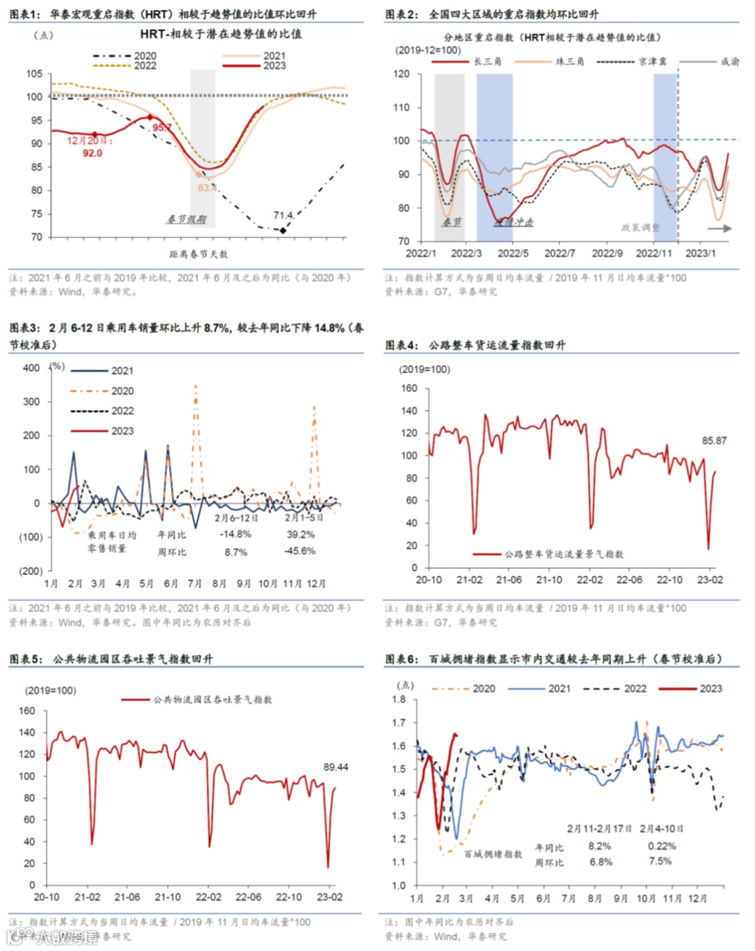 居民出行及消费等指标同比继续回升,工业生产增速大多持续加快、特别是基建复工或强于往年,物流同比降幅略有走阔;商品房成交面积降幅继续走阔,二手房同比持续上行。截至2月18日,华泰宏观重启指数(HRT)较潜在趋势值的比值与去年农历同期同比上行0.5%(v.s.前一周0.1%),分项指标中上周百城拥堵指数和18城地铁客运量较去年农历同期分别回升8.2%、19.8%,航班数同比回升1.7%。而物流指标同比降幅略有走阔:全国整车货运流量景气指数环比小幅回升5.8%,同比降幅16.1%、较前一周降幅15.2%略有走阔。农历对齐后,上周电影票房同比增长22.2%,但乘用车销量同比下行14.8%。工业生产同比增速大多回升:农历对齐后,上周高炉/半钢胎开工率同比上行4.8/16.4个百分点,焦化开工率同比略回落-0.5个百分点,建筑钢材成交同比上行28.1%,但水泥开工率同比回落7.5个百分点。地产方面,新房降幅仍有走阔、二手房成交持续走强:农历对齐后,上周30城商品房成交面积同比下行-20.8%,较前一周降幅13.8%仍有走阔;26城二手房成交面积同比上行51.1%,较前一周43.1%继续走高。此外,2月6日-12日全国土地成交面积环比下行2.4%,同比回落10.9%,较前一周同比降幅7.8%进一步下行。