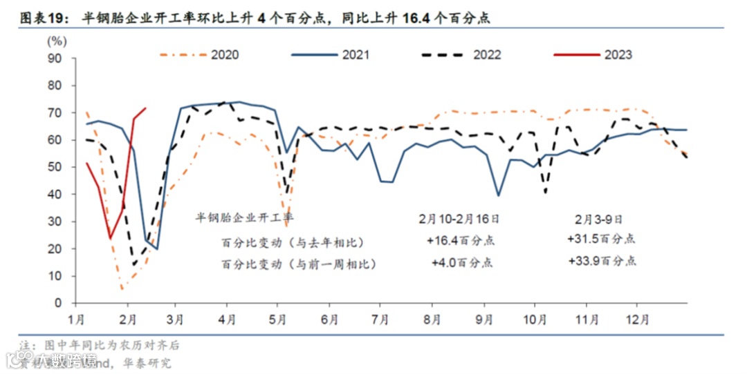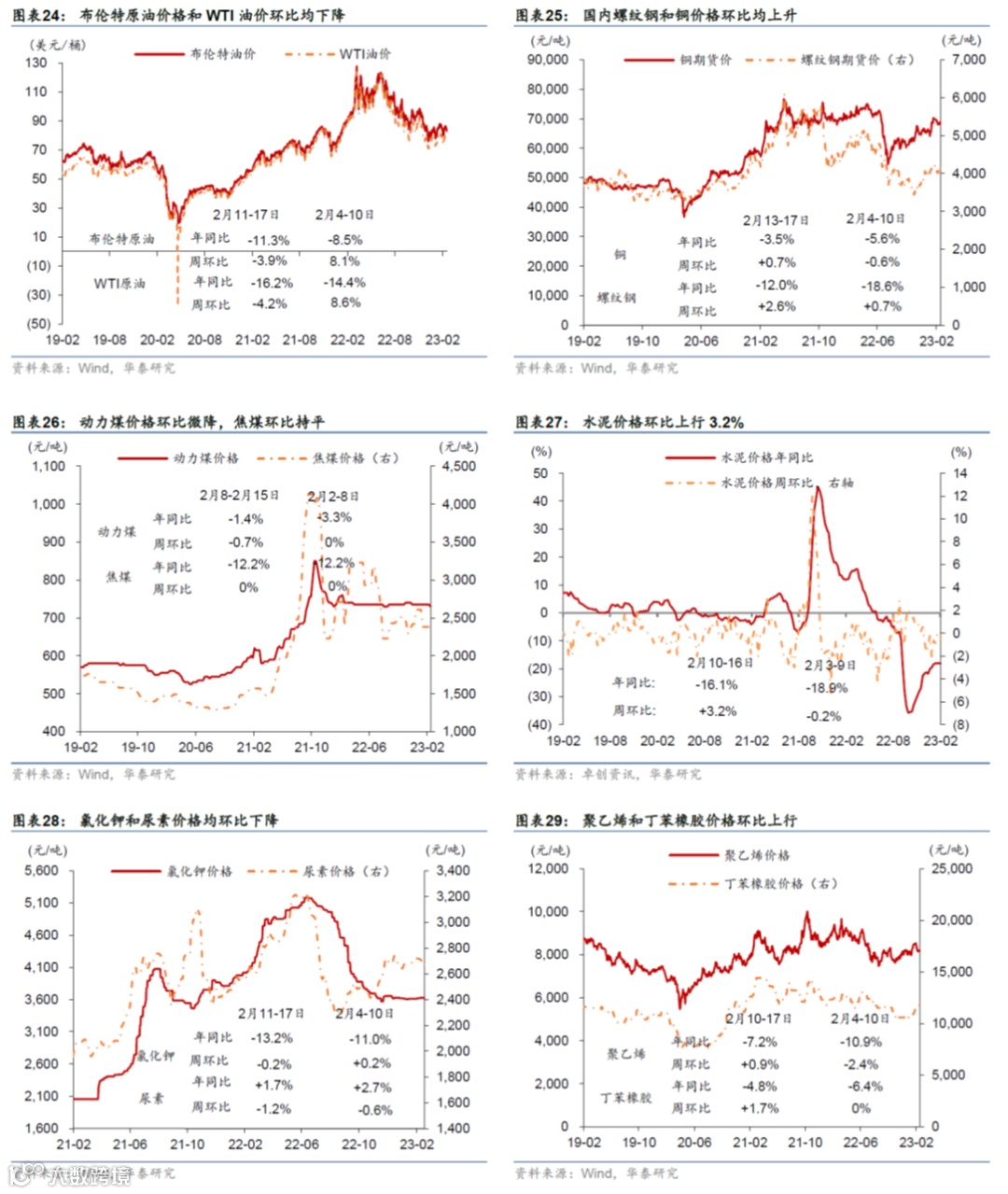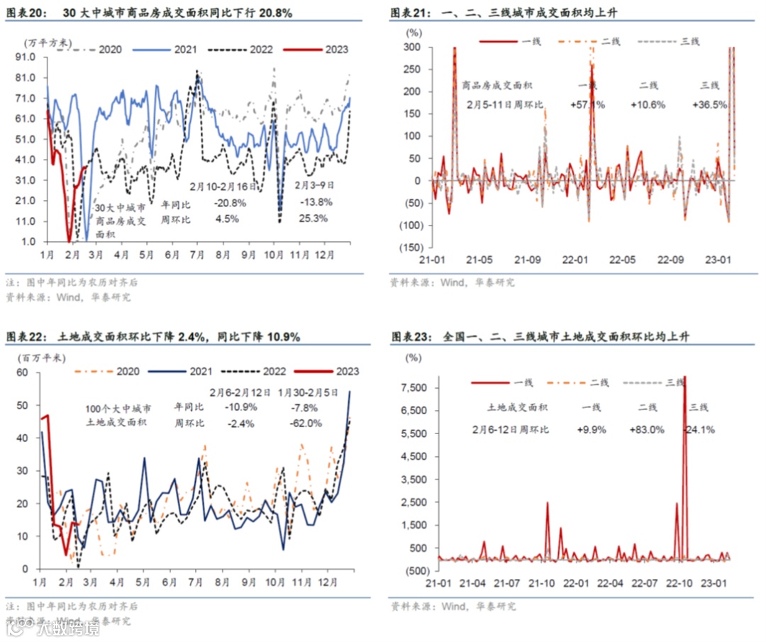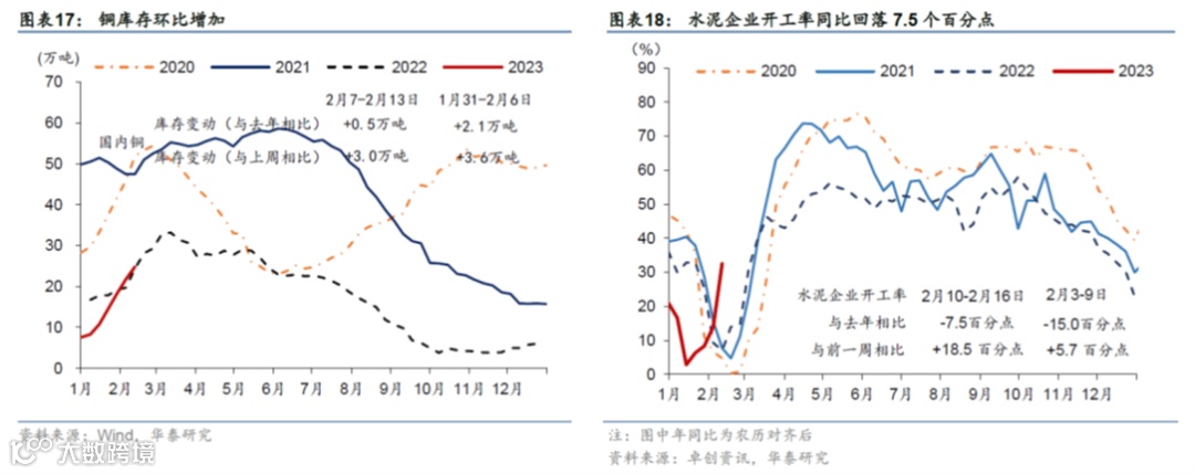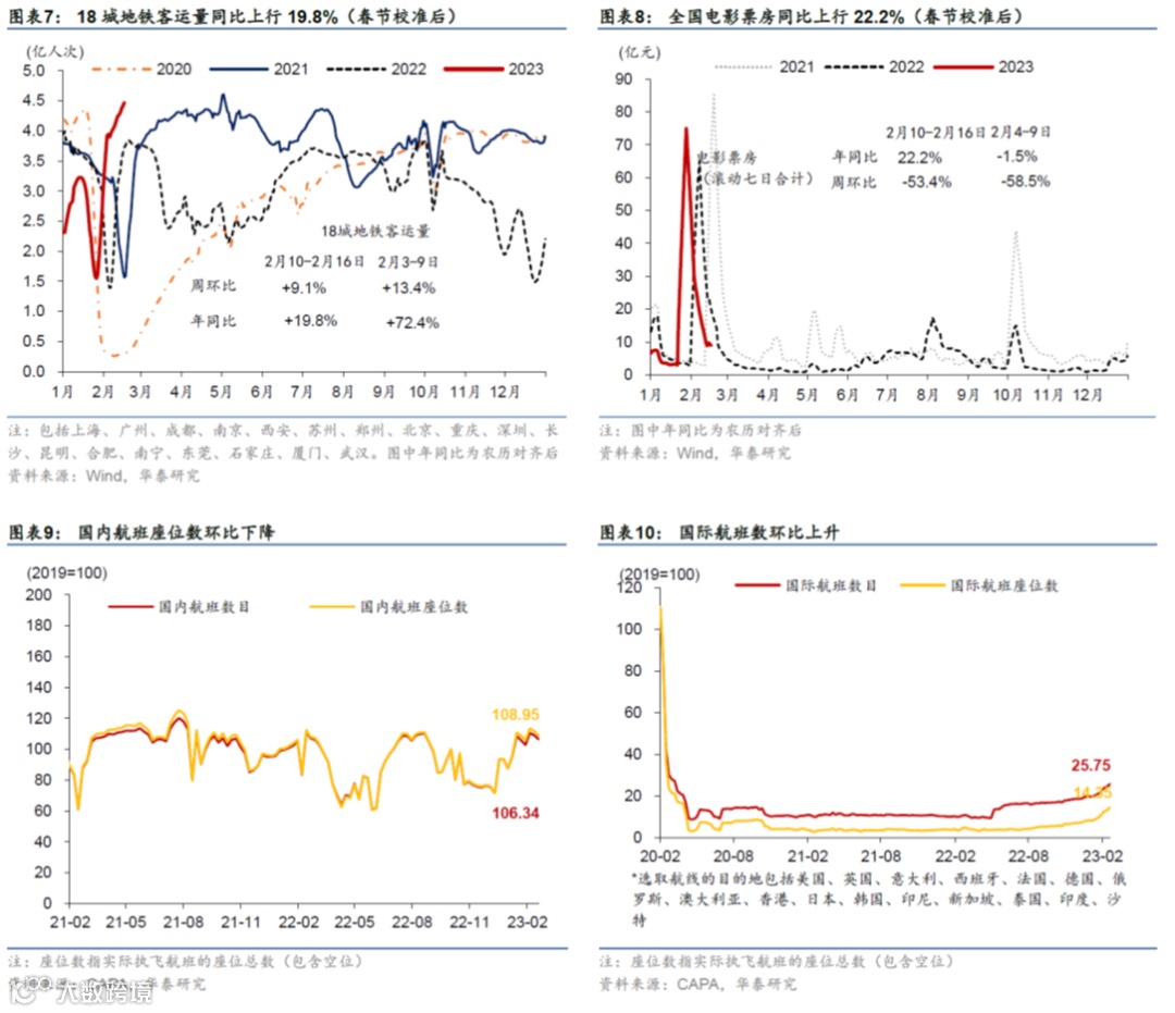 居民出行及消费等指标同比继续回升,工业生产增速大多持续加快、特别是基建复工或强于往年,物流同比降幅略有走阔;商品房成交面积降幅继续走阔,二手房同比持续上行。截至2月18日,华泰宏观重启指数(HRT)较潜在趋势值的比值与去年农历同期同比上行0.5%(v.s.前一周0.1%),分项指标中上周百城拥堵指数和18城地铁客运量较去年农历同期分别回升8.2%、19.8%,航班数同比回升1.7%。而物流指标同比降幅略有走阔:全国整车货运流量景气指数环比小幅回升5.8%,同比降幅16.1%、较前一周降幅15.2%略有走阔。农历对齐后,上周电影票房同比增长22.2%,但乘用车销量同比下行14.8%。工业生产同比增速大多回升:农历对齐后,上周高炉/半钢胎开工率同比上行4.8/16.4个百分点,焦化开工率同比略回落-0.5个百分点,建筑钢材成交同比上行28.1%,但水泥开工率同比回落7.5个百分点。地产方面,新房降幅仍有走阔、二手房成交持续走强:农历对齐后,上周30城商品房成交面积同比下行-20.8%,较前一周降幅13.8%仍有走阔;26城二手房成交面积同比上行51.1%,较前一周43.1%继续走高。此外,2月6日-12日全国土地成交面积环比下行2.4%,同比回落10.9%,较前一周同比降幅7.8%进一步下行。
