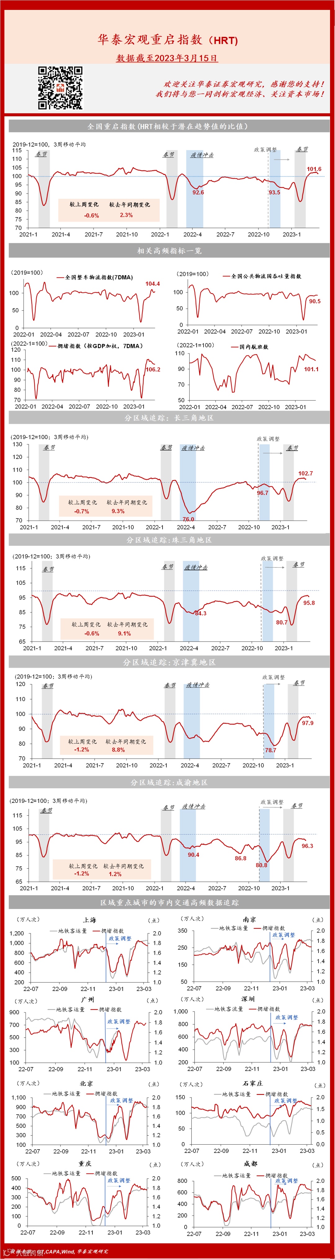 春节后全国层面HRT指数持续上升但近日有回落趋势,相较于潜在趋势值的比值已经超过政策调整前,且高于2022年同期,经济活动稳步恢复趋势明显。截至3月15日,全国层面HRT指数高出潜在趋势值1.6%,较潜在趋势值的比值同上周环比下行0.6%,与去年同期相比上升2.3%。