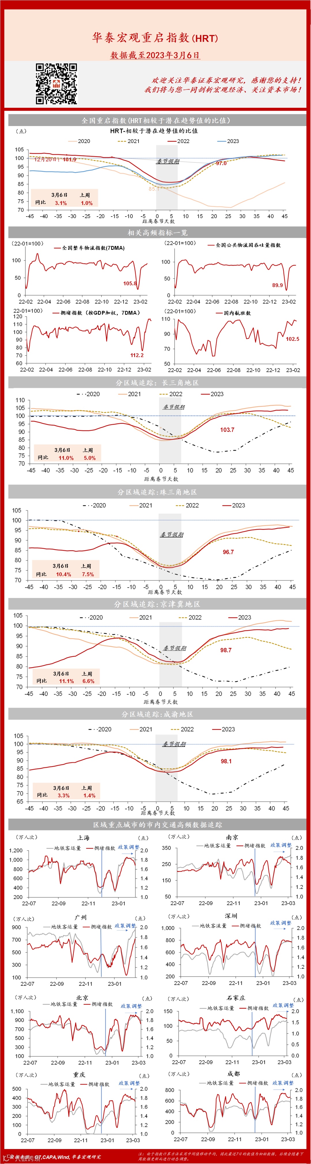 截至春节后第44日,华泰宏观重启指数(HRT)较潜在趋势值的比值与去年春节同期同比增长3.1%(v.s.上周0.7%),同比降幅扩大。