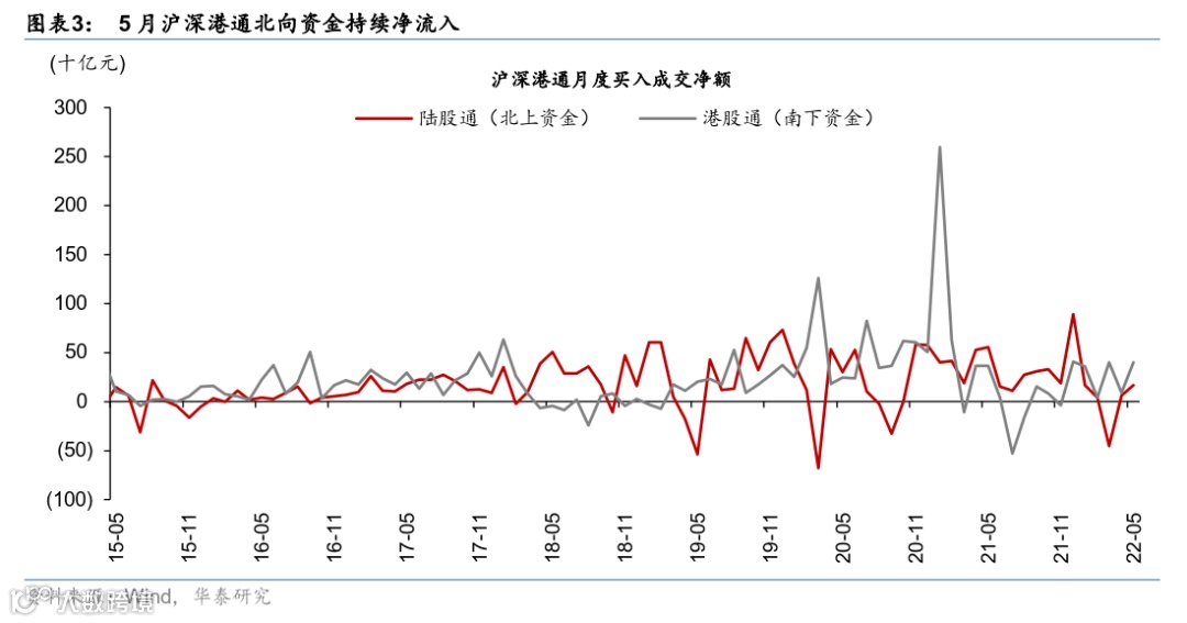 3)5 月外汇流出压力可能继续缓和。随着国内疫情缓和、以及近期一系列稳增长政策出台,5 月人民币贬值压力有所缓解——5 月人民币兑美元汇率贬值 1.1%,较 4 月 3.7%的跌幅明显收窄,但随着美元走弱,人民币兑一篮子货币的 CFETS 人民币汇率指数的跌幅从 4 月的 1.0%扩大至 3.1%(图表2)。证券投资项下,5 月沪深港通北向资金的净流入规模环比小幅扩大,显示跨境资本对人民币资产的信心有所回升(图表 3)。