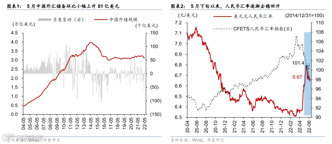 随着国内疫情缓和、以及美元指数初现见顶迹象,短期内人民币贬值压力有所缓解。往前看,人民币汇率走势主要取决于国内疫情走势、以及国内增长预期和金融风险的演变。如我们在《人民币贬值向全球传递了什么信号?》(2022/5/19)中分析,4 月下旬以来,人民币汇率快速贬值,向全球传递中国需求走弱的信号,可能带动中美经济周期和政策预期从分化走向融合。随着市场对全球增长预期下调,美联储超预期鹰派的可能性下降,而欧央行超预期加息可能施压美元,美元指数可能在 6 月迎来“回调窗口期”。另一方面,国内疫情缓和、以及加速复工复产降低了疫情及防控措施相关的不确定性,带动人民币汇率企稳回升。往前看,人民币汇率走势仍主要取决于经济基本面,即国内疫情、以及相关的增长预期和金融风险的演变。