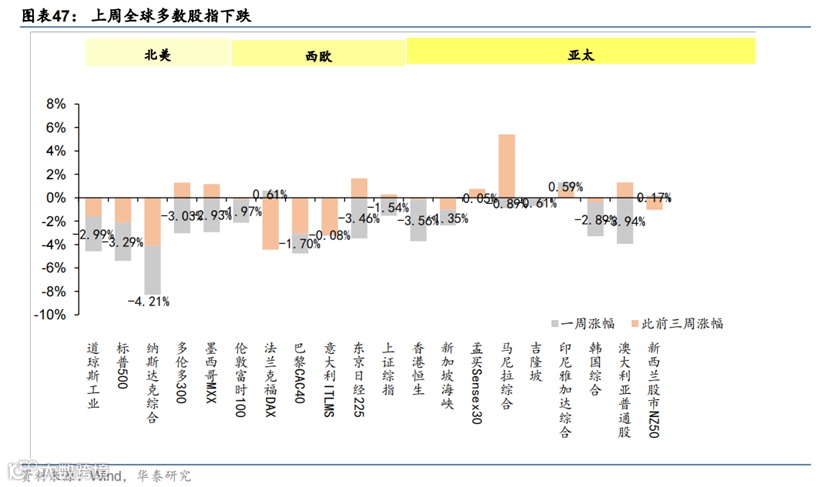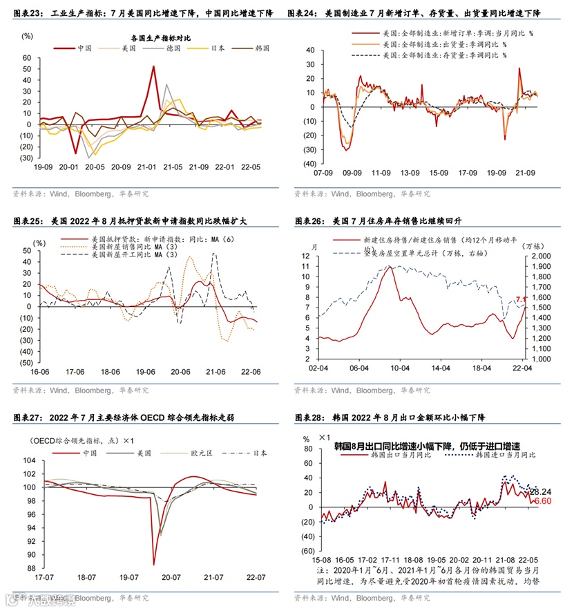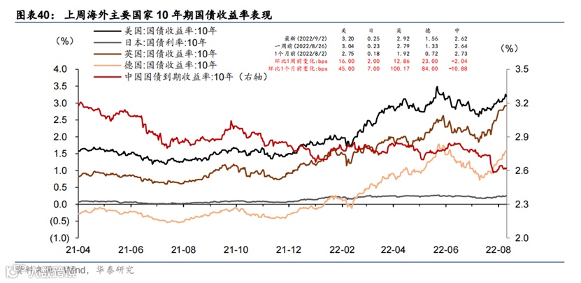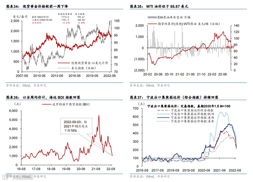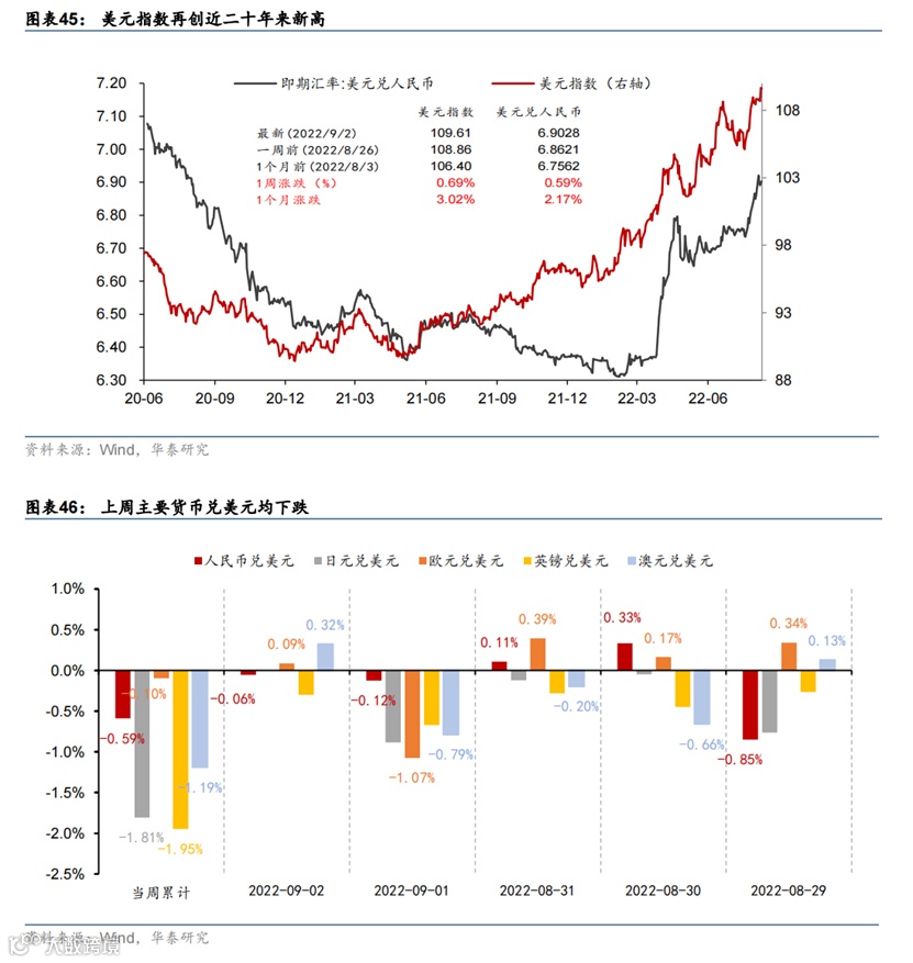 美元指数继续走高、全球股市连续两周下跌。大宗商品以及运价指数普遍下跌。美元指数单周再度上涨0.7%至109.6,继续创下近二十年来新高;美债10年期利率一周上行16bp,收于3.2%;德国10年期国债利率一周上行23bp,收于1.56%,两者都上行至7月第一周以来的高点。美债利率上行或反映金融条件加快收紧(缩表加速)的预期。WTI油价跌至87美元,单周跌7%;有色金属——铜(-8.8%)、锌(-14.5%)价格一周大幅下跌。以一周均价计,BDI海运价格上周继续下跌近15%。全球股指连续两周下跌,纳斯达克综指一周跌4.2%,再度领跌主要股指。