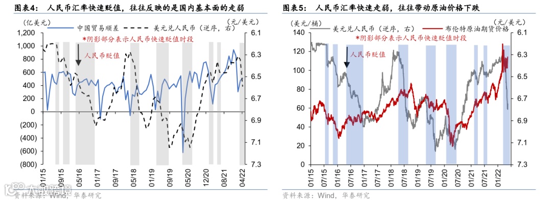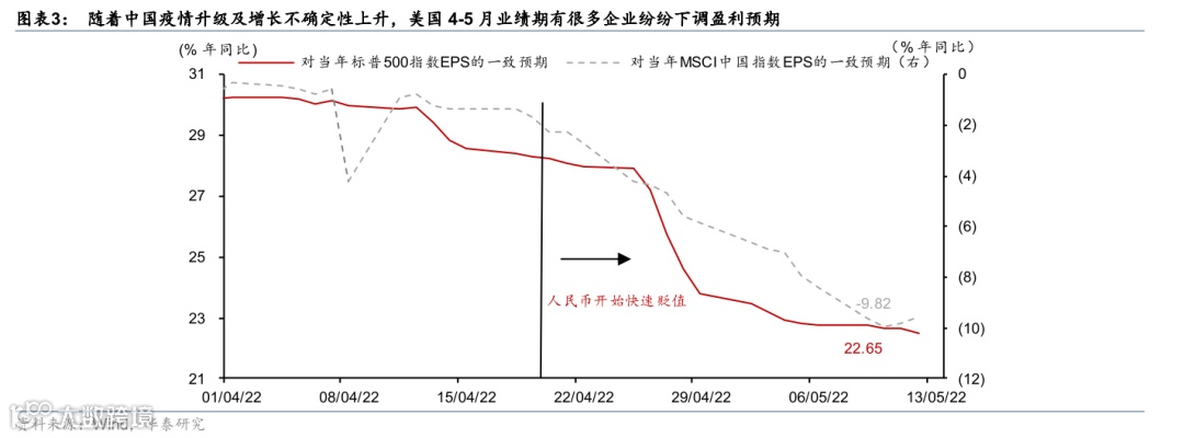 略为展开——5 月 5 日美联储议息会议后的市场值得回味。5 月 5 日议息会议决议并未比预期鹰派,且市场对 2022 年加息预期有所下调,当日风险资产表现亮眼(参见《联储如期加息 50bp 但缩表速度温和》,2022/5/5),但次日即大幅回调、而利率并未回升。由此可见,在人民币快速贬值的阶段,驱动市场表现的可能已经不只是货币政策紧缩本身,而也开始加入了对全球增长前景相关的不确定性。