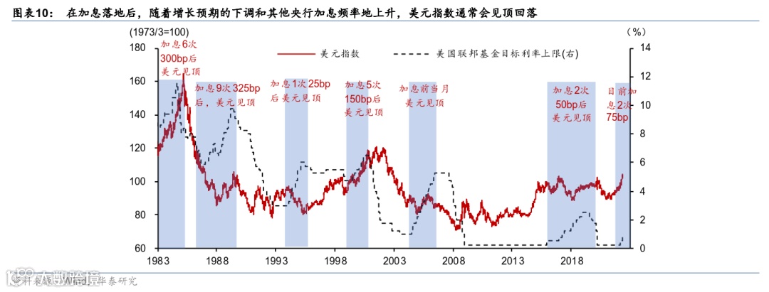 关于这一点,我们重申此前观点,即美元指数方面,可能在两次 50 基点加息及缩表开始后的 6 月迎来“回调窗口期”(参见《人民币缘何突然走弱、后续如何?》,2022/4/25)。回顾美联储历次加息周期,美元指数上涨最快的时候通常是加息预期快速升温的时候,而在加息落地后,随着增长预期的下调和其他央行加息频率地上升,美元指数通常会见顶回落(图表 10)。回测美联储这几个月来态度转变的频率,不排除在 5-6 月两次 50 基点加息后有所观望——主要原因是二季度经济和劳工相关数据、以及中国疫情对供应链的影响进一步显性化后,可以有再次评估的窗口。此外,值得注意的是,俄乌战争将欧洲财政扩张实实在在提到了议事日程上,而欧洲货币政策转向偏紧缩立场,也可能紧随联储加息。