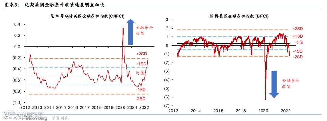 人民币对美元快速升值,进一步推升了美元升值的速度、压低美股盈利预期、并为大宗商品价格降温从而推升信用利差。此前联储快速拉升市场的加息及缩表的预期,也起到了收紧金融条件的作用,但人民币快速走弱,明显强化了这一趋势——图表 8 显示,虽然美联储在 4 月下旬之后的表态并未继续比市场预期更鹰派,但美国的金融条件收紧速度明显加快。究其原因,股、债、汇三个渠道融资条件同时收紧,和人民币汇率变化带来的一系列“连锁反应”不无联系。