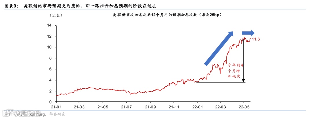 随着人民币贬值以及全球增长预期有所降温,虽然加息、缩表可能近期继续按部就班地进行,但联储的表态可能暂时不再比市场预期鹰派。同时,虽然目前通胀仍是“最大政治”,但联储也会在边际上更多关注经济和劳工市场动能减弱的信号。金融条件收紧, 尤其美元走强、信用利差走阔这两项,也是联储判断货币政策收紧是否开始压制总需求增长,开始为长期核心通胀预期降温的重要观察指标。联储在去年年底以来的一系列研究中暗示,联储政策的目标更多是“实体经济”而非“金融市场”,所以,相对而言,股市的表现可能不是联储反应方程中最“敏感”的变量。然而, 美元大幅走强, 以及信用利差走阔,可能是利率水平是否开始限制企业盈利和偿债能力的更直观的指标。——从政策反馈的角度分析,当美元开始大幅走强,信用利差开始走阔,也可能是联储紧缩的一个“新阶段”——即美联储比市场预期更为鹰派、即一路推升加息预期的阶段在过去(图表 9)。
