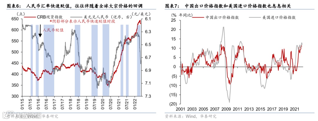 2) 从价格渠道,人民币走弱是中国向全球输出中国进口商品、即大宗商品和原材料产品通缩的信号,虽然供给仍结构性偏紧,但短期中国需求下行为全球商品价格“降温”。这个判断很直观,图表 4-6 刻画的是 2015 年来,也就是人民币进入相对更加“清洁”的浮动阶段后,人民币汇率快速贬值,往往 1)反映的是国内基本面的走弱,而 2)往往伴随着全球大宗价格的回调。