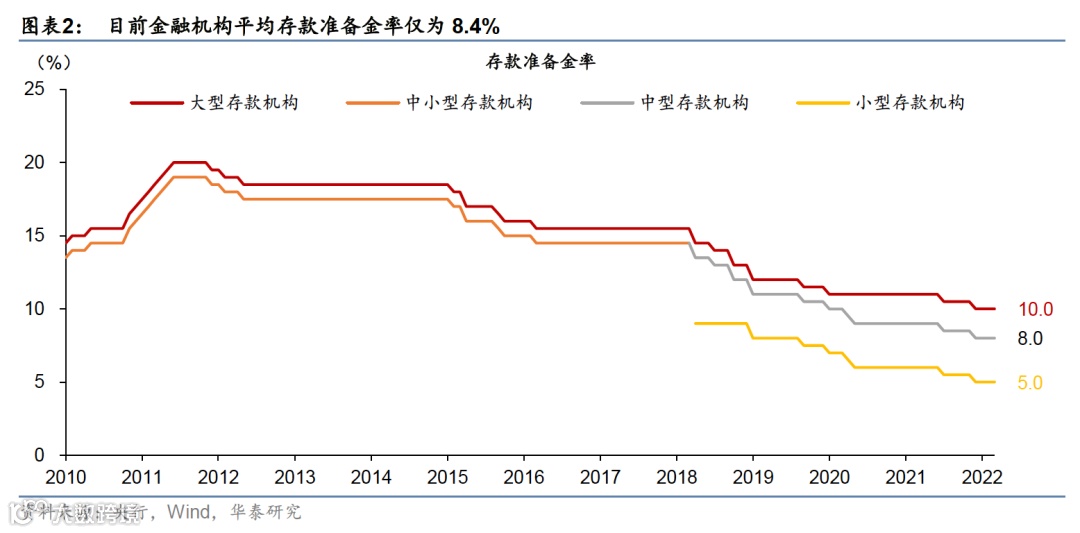 联储快速加息背景下,央行降息或主观上受到一定制约,从而诉诸降准。但是在降融资成本层面,降准效用或不及直接降息。降准直接释放基础货币,相当于给银行减税,通常会传导到实体经济融资成本下行。全面降准50个基点或将释放约1万亿元流动性,降低金融机构资金机会成本每年约130亿元。据央行估算,一次50个基点的降准能够降低银行在贷款利率上的加点约2-3个基点,而两次降准有望带动1年期LPR利率下调5个基点,去年12月在MLF未降的情况下1年期LPR调降5个基点即是两次降准的累积效应。从这个层面看,降准可以部分替代降息的功用,有助于降低企业融资成本。