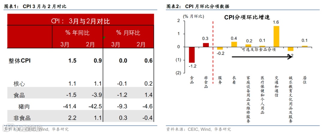 3月CPI为1.5%,较上月的0.9%上行,环比持平。3月CPI月环比增速从2月的0.6%下降至0%,主要是节后季节性回落。3月核心CPI同比增速录得1.1%,较2月持平,月环比增速为-0.1%(图表1)。
