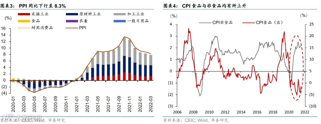 3月疫情压制物流、供给收紧,叠加海外价格上涨,国内食品和能源价格上涨推升CPI和PPI环比,但核心CPI低迷显示需求疲弱。