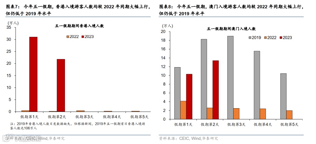香港、澳门入境游客人数同比大幅上行。2023年五一假期首日香港入境游客人数达31万人次(同比增长630%),而香港入境事务处4月26日预计,今年五一假期(即4月29日至5月4日)约有461万人次(包括香港居民及访客)进出香港,对比2019年五一期间(4月30日至5月5日)约668万人次回落约31%(图表7-8)。2023年五一假期前两天,香港和澳门的入境人数分别累计达69万人次和23.69万人次,同比2022年增长1014%和252%。
