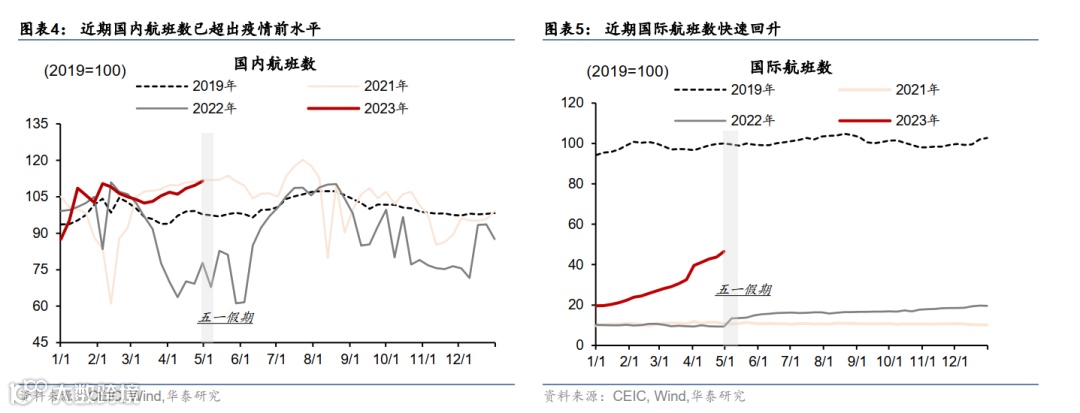 作为疫情防控优化后的首个五一小长假,居民出行热情高涨、消费意愿大增,叠加促消费政策持续发力,节日期间消费活动异常火爆。截至5月1日的高频数据显示,境内出行活跃度已超出疫情前(2019年)水平,境外出行活动也明显恢复,文娱及旅游等消费数据表现亮眼。另一方面,节日期间酒店、机票等价格涨幅可观,反映在需求回升与产能整合的双重推动下、服务消费行业的定价权明显上升(具体分析请见《2023年哪些行业会有定价权?》,2023/3/26)。