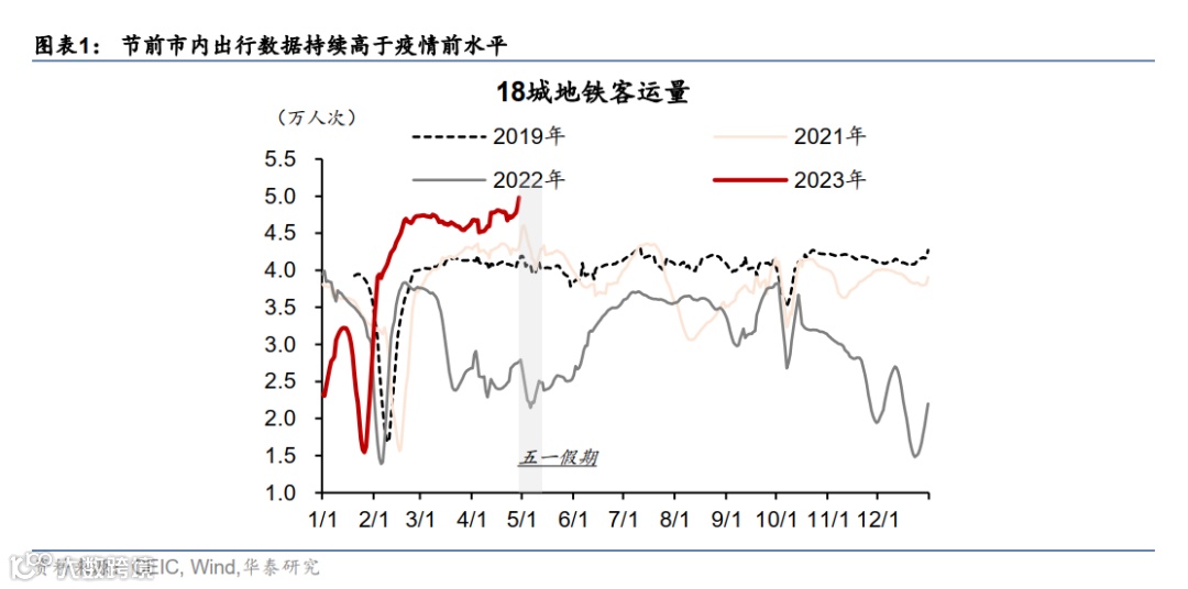节日期间,居民境内出行活跃度进一步攀升,明显超出疫情前水平,同时境外出行活动也明显恢复。今年春节过后,居民出行活跃度快速修复,并维持高位。五一期间,居民境内出行活动进一步走强,明显超出2019年同期水平。其中,市内出行持续高于疫情前水平,4月27-29日18城地铁客运量较2022年同期上行76.1%,达2019年同期的1.4倍(图表1);城际出行的反弹更为明显,交运部数据显示4月29日全国营业性客运量达5,699万人次,较2022年同期增长151.8%,已超过2019年同期水平,其中铁路、道路、水路、民航发送旅客数量分别较去年同期回升343.9%、98.8%、86.2%及441.8%,恢复至2019年的113.0%/100.3%/115%/268.3%(图表2-5)。交通部预计五一假期前三天,全国铁路、公路、水路、民航预计发送旅客总量15932.4万人次,比2022年同期增长161.9%。其中,铁路/公路/水路/民航预计发送旅客数比2022年同期增长460.9%/99.7%/86.2%/546%。具体看,