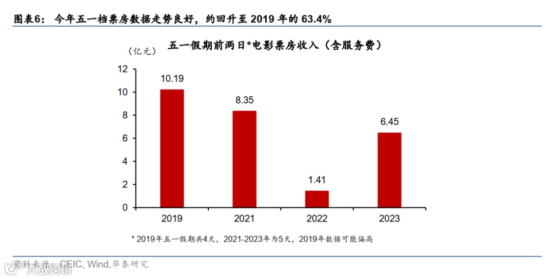 电影消费同比大幅回升。据灯塔数据,假期前两日票房收入达到6.45亿元,约为去年同期的4.6倍,回升至2019年的63.4%(图表6);截至4月30日18点,2023年五一档新片总票房(含预售)突破7亿,远超去年同期水平(五一期间票房约3亿元),据猫眼数据预测,今年五一电影总票房有望超过2021年同期的16.7亿元。
