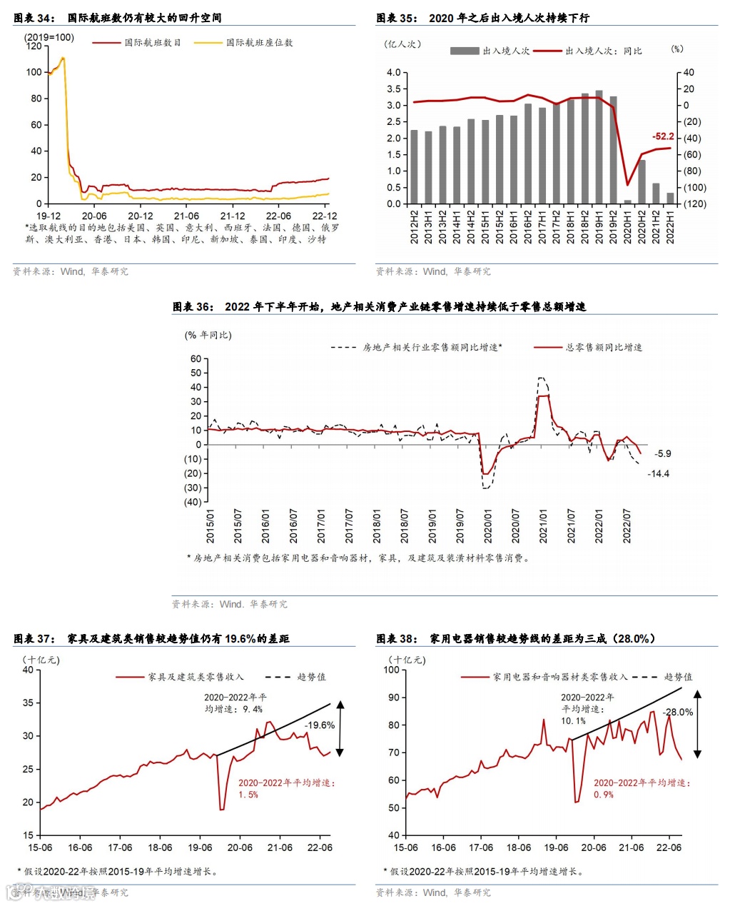 此外,中国本轮周期特有的一个现象是,“重启相关”消费中也可能包含地产需求。本次疫情冲击叠加地产周期下行影响,地产相关消费总体水平拖累总消费增速,地产相关消费产业链零售板块(家具、家电、装潢)在2021年约占GDP的5%,而截至2022年11月三项加总当月零售增速为-14.4%,低于总零售额降幅5.9%。家具及建筑类销售较潜在趋势值仍有19.6%的差距,而家用电器销售额较趋势值则有接近三成差距(28.0%,图表37-39)。