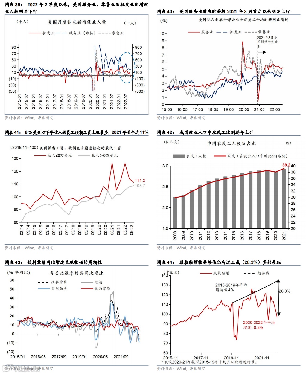 我国服务业佣工在劳动力中的占比仍然较高,随着服务业回暖带来的收入修复可能推升大众消费类产品销售回升。以农民工为例,根据统计局 ,2021 年中国农民工的规模已经达到 2.93 亿人,占全国就业人员的 39.2%。随着2023年疫情对于出行及日常经济活动的影响持续减弱,服务业用工需求可能迅速回升,推升服务业佣工工资上涨,从而有望提振大众消费类商品零售(图表43)。