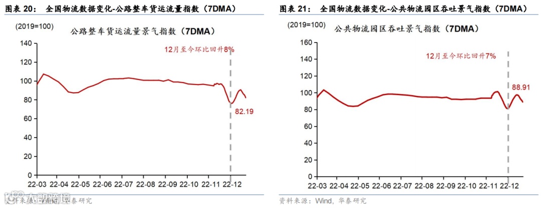 虽然防疫政策的优化可能造成疫情短期扩散风险持续,导致城市居民日常出行在放开后的一段时间有所回落,但截至12月20日,部分城市的高频数据已经出现再次回升趋势。因而可以合理推断,防疫政策快速优化对于人流物流活动的刺激是显著且迅速的,且其力度和效果很可能胜于今年二季度经济回升,而疫情蔓延所造成的短期回落也将在达峰后得以扭转。