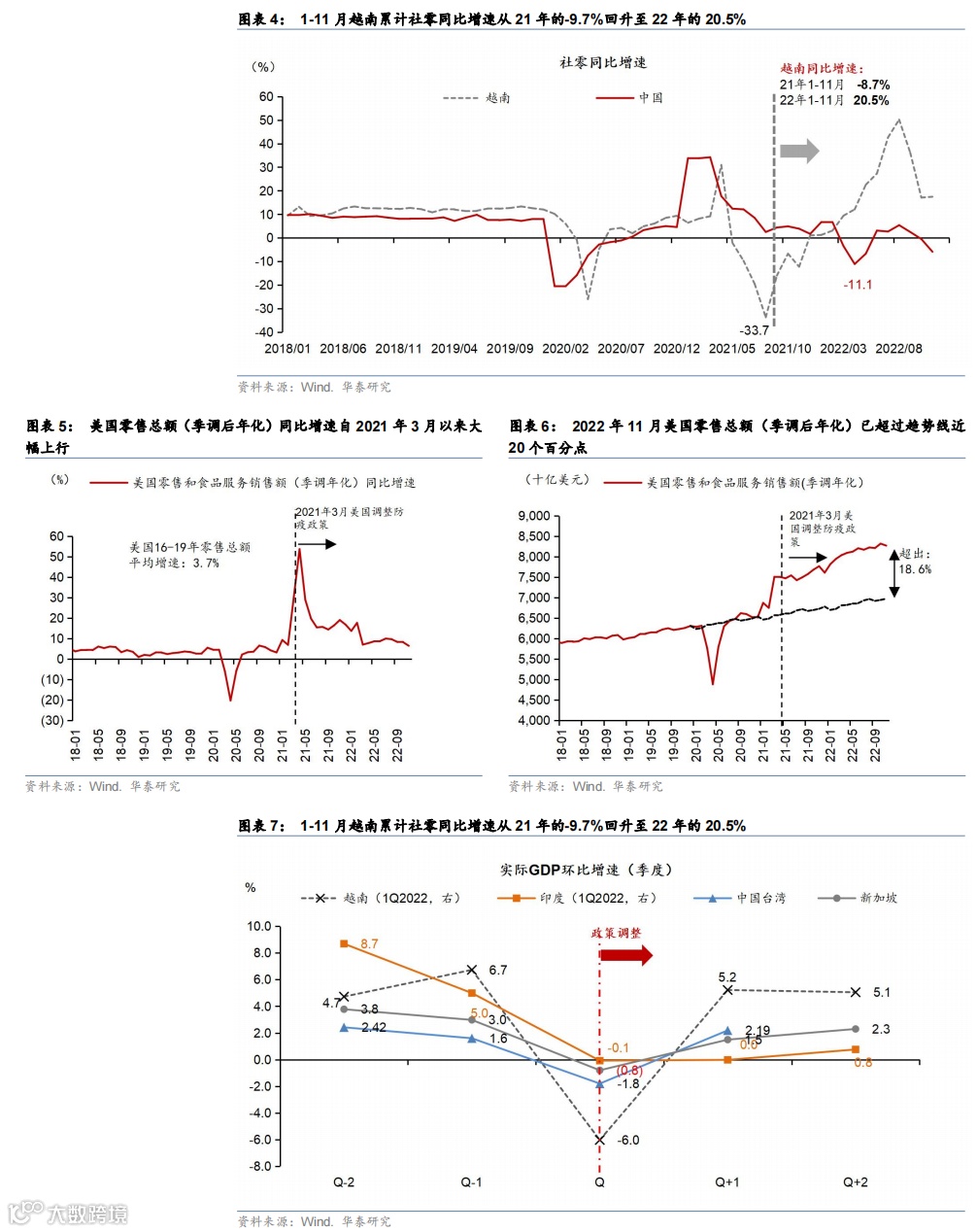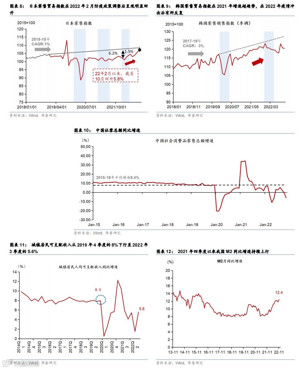 其他国家的经历也显示,防疫政策放开总需求、尤其是消费需求回升弹性较大。多数国家在防疫政策调整后,GDP实际增速大多出现1-2个季度的环比回升(图表7),比如越南在疫情政策调整后GDP环比增速连续两个季度达到5%以上,而印度和新加坡也都实现了连续两个季度的环比回升,不过政策调整的时间及所处的全球贸易环境也可能对GDP回升带来影响:2022年3季度日本在疫情调整第二季度GDP环比便出现回落,主要原因是能源价格上涨大致逆差扩大,拖累GDP同比增速。