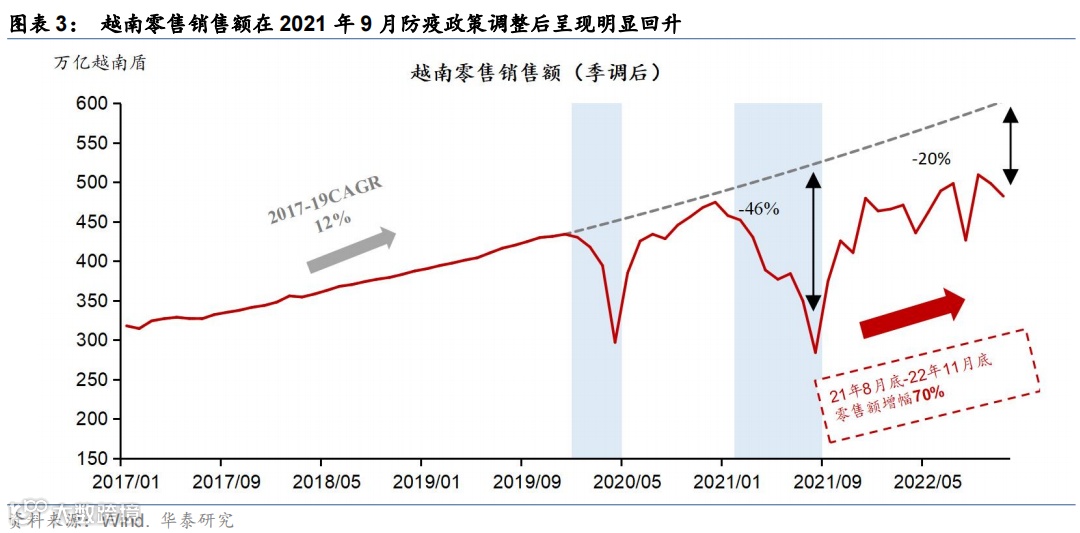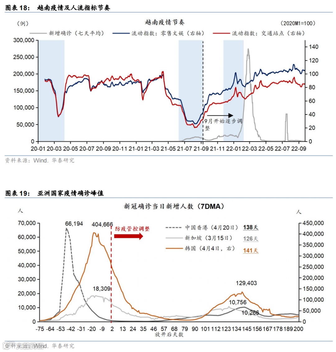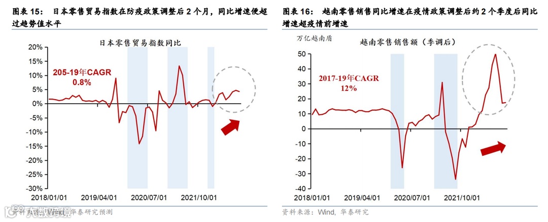 从消费恢复节奏来看,以越南为例——防疫政策调整初期随着必要的出行回升,需求实现较为陡峭的反弹,此后随着感染率的上升出现一定回调,在疫情再次达峰之后消费实现稳步回升(图表18)。越南在疫情政策调整的初期,零售额呈现较为陡峭的回升,随着出行活动的迅速恢复,而随着疫情管控措施的放开,感染率(特别是重症率和死亡率)可能也会随之上行、医疗资源面临一定压力,居民可能会主动减少出行频次,因此出行指标及社零增速有所回撤,但一个月左右随着疫情达峰,出行活动和社零逐步实现稳步的回升。