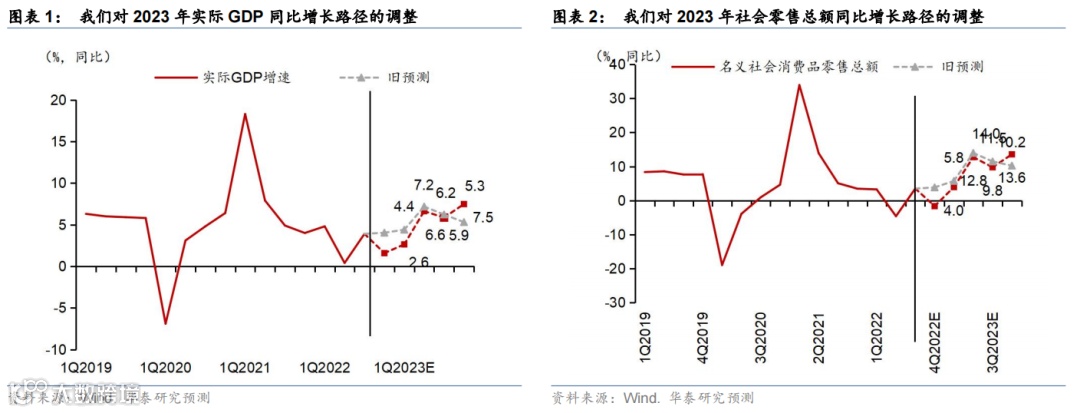 结合近期疫情和防疫政策的变化,我们对2023年消费增长路径的最新预测为年同比增长10.1%、而2023年4季度单季同比增速有望达到13%以上。由于防疫政策优化比此前假设更早、更有力,预计最早于2023年清明节期间,出行人流就可能恢复到疫情前9成左右的水平,明年2季度中,疫情的对消费的“周期性”冲击就有望大体消退,2023年消费增长回升路径可能呈现 “陡峭回升”态势(参见《2023年宏观经济展望更新》,2022/12/12)。