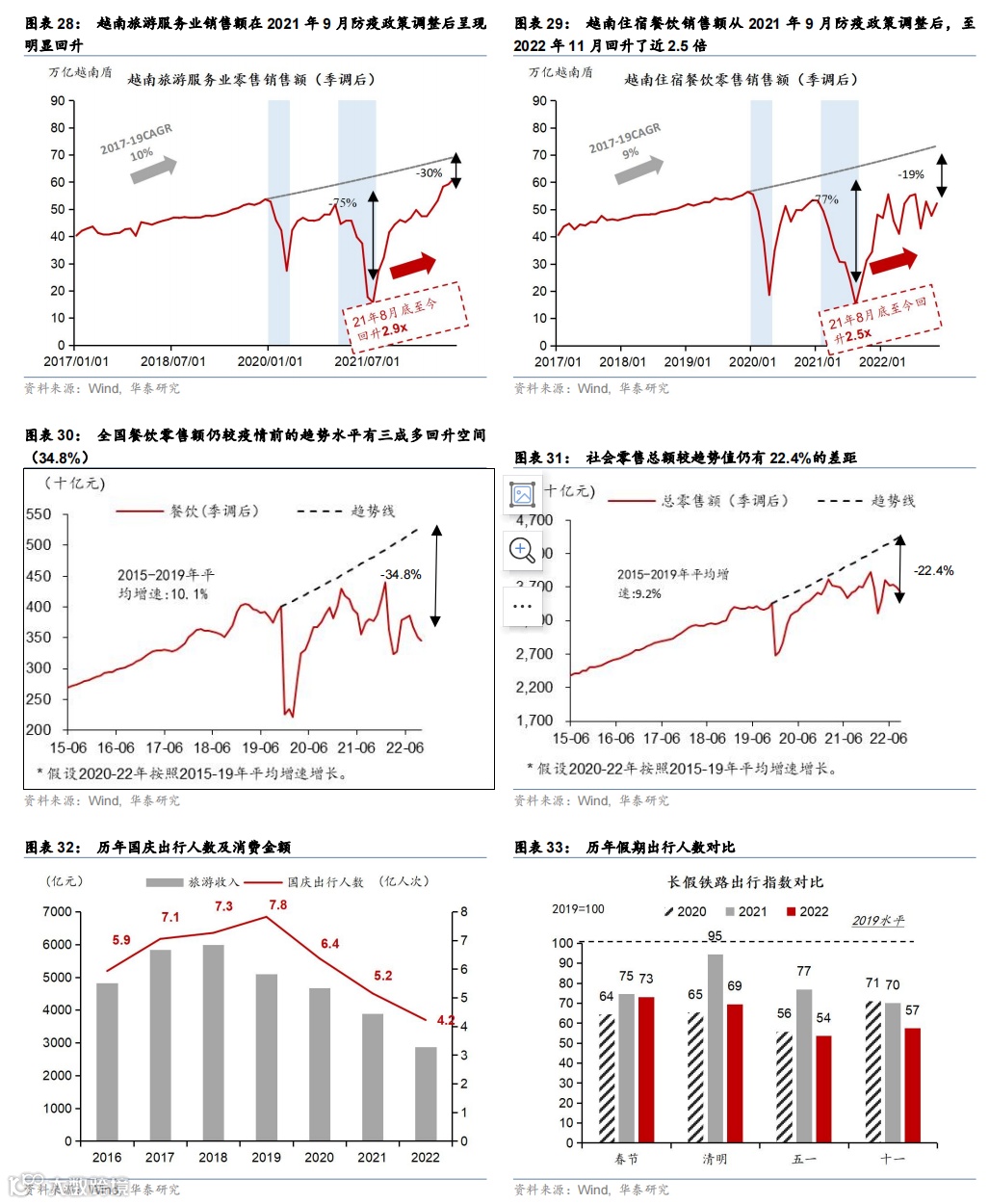 首先,体验式消费、包括社交、商务活动、旅游、婚嫁等服务消费有较大的反弹空间。分项来看,越南从2022年8月的低点至今住宿餐饮零售销售额和旅游服务业从低点的回弹幅度超过200%,距趋势线从低点超过7成的差距收窄至只有2-3成。从我国的情况看,体验式消费同样有较大的回弹空间(图表29-30)。