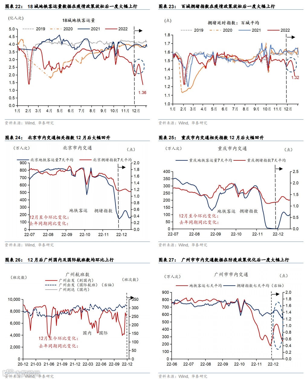 作为佐证,12月来随着防疫政策快速优化,高频指标显示全国层面人流及物流的“活跃度”均开始恢复、且回升“斜率”比上海6月后复产复工阶段更为“陡峭”。预计12月经济增长就有望实现环比回升,因此我们预计1季度实际GDP环比折年率11%,同比增速2.6%, 零售同比增速回升至4.0%。“二十条”优化政策出台之后,重点城市地铁客运量及全国拥堵延时指数都立即出现抬升,一周内分别回升35%和4%(图表23和24),尽管之后有所反复,但仍相较于二季度上海解封后的响应速度更快、回升幅度更大(6月1日-6月日,重点城市地铁客运量及全国拥堵延时指数分别上行13.0%/下行1.6%)。从重点城市层面,例如率先调整疫情防控政策的广州,其国内航班数量较放松前回升幅度超70%,12月地铁客运最高点较放开前上升近80%,拥堵指数也同样在放开后迅速出现抬升。北京、重庆等地的高频数据也遵循类似的变化趋势(图表25-28)。