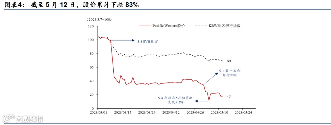 3月8日(硅谷银行暴雷前)至5月12日,股价累计下跌83%。主要原因包括:1)2023Q1存款相对2022Q4流失高达17%,存款在总资产中的占比下降19个百分点,Pacific Western 增加了从联邦住房贷款银行(FHLB)、联储贴现窗口以及联储BTFP的借款。2)5月4日有报道称,Pacific Western正在评估包括出售在内的战略,而5月数据显示,5月初的一周之间,存款再次流失9.5%,导致股价在5月4日大幅下跌51%。3)2022Q4未保险存款占比为52%,2023Q1降低至27%。