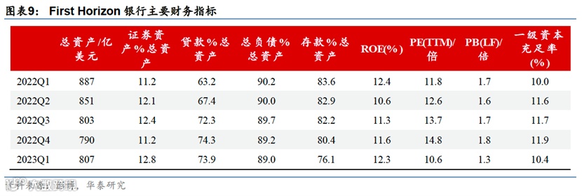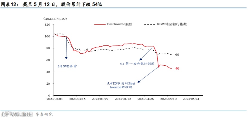 3月8日至5月12日,股价累计下跌54%。主要原因包括:5月4日加拿大道明银行(TD)以监管不确定性为由,取消了对其收购计划,导致股价大幅下跌。2022Q4 First Horizon未保险存款占比为48%,2023Q1存款相对2022Q4流失3%。由于疫情期间First Horizon没有大规模增加证券投资,截至2022年底First Horizon浮亏占比较小,主要“脆弱性”可能来自商业地产和其他商业贷款。
