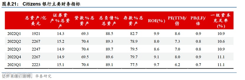 Citizens Financial Group(简称“Citizens”,公民金融集团)总部位于罗德岛普罗维登斯,经营活动集中于美国东北部的11个州,是美国第9大银行,2023年1季度总资产为2223亿美元,2022年被《银行家》杂志评为2022年年度最佳银行。从资产端来看,证券类投资占比为15%,贷款占比为70%(商业地产、其他商业贷款和消费贷款分别为14%、23%和31%)。从负债端来看,2023年1季度存款在总资产中的占比为77%,相对2023年1季度下降5个百分点;长期债务占比为8.5%,相对2022年1季度上升5.4个百分点。