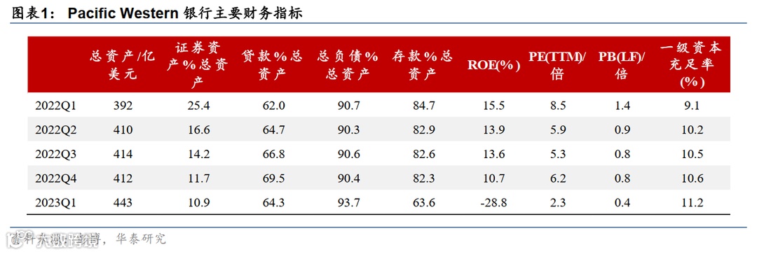Pacific Western Bank(简称“Pacific Western”,西太平洋银行)总部位于加州比佛利山庄,营业活动主要集中在加州,是美国第33大银行,总资产为443亿美元。Pacific Western主要是为中小型企业提供商业银行服务,同时也为创业企业、风险资本和私募股权投资者提供服务。2016-2023Q1总资产增长103%,总存款最多增长115%。从资产端来看,2023Q1证券类投资占比为11%,贷款占比为64%(商业地产、其他商业贷款和消费贷款分别为23%、12%和9%);从负债端来看,2023Q1存款在总资产中占64%,长期债务占29%。
