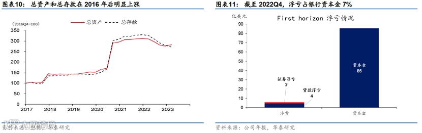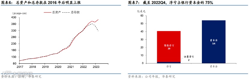 3月8日至5月12日,股价累计下跌52%。主要原因包括:1)资产端“浮亏”较严重,截至2022年12月底,贷款和证券投资的浮亏达到银行资本金的75%。2)2022Q4未保险存款占比为53%,2023Q1降至45%。2022年开始存款持续流失,截至2023Q1累计下降16%,存款在总资产中的占比下降12个百分点;2023Q1存款相对2022Q4流失3%。