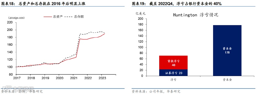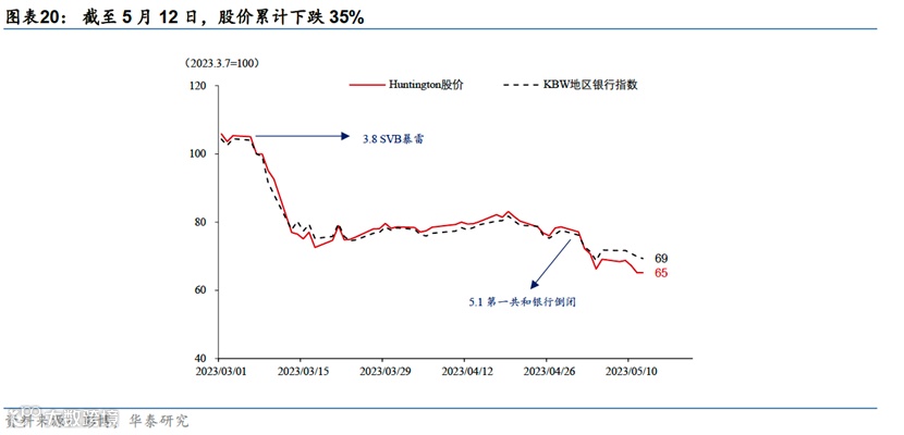 5. Huntington Bank(亨廷顿银行)经营活动集中在中西部的10个州,为美国第14大银行,总资产1891亿美元。3月8日-5月12日,股价下跌35%。截至2022年底,贷款和证券资产的浮亏已经相当于银行资本金的39%。2023Q1存款下降2%。