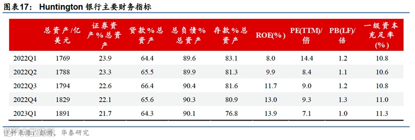 Huntington Bank(简称“Huntington”,亨廷顿银行)总部位于俄亥俄州哥伦布市,经营活动主要集中在中西部的10个州,是美国第14大银行,2023年1季度总资产为1891亿美元。从资产端来看,证券类投资占比为22%,贷款占比为64%(商业地产、其他商业贷款和消费贷款分别为11%、25%和28%)。从负债端来看,2023年1季度存款在总资产中的占比为90%,短期债务占比为3.6%,相对2022年1季度上升3.2个百分点。