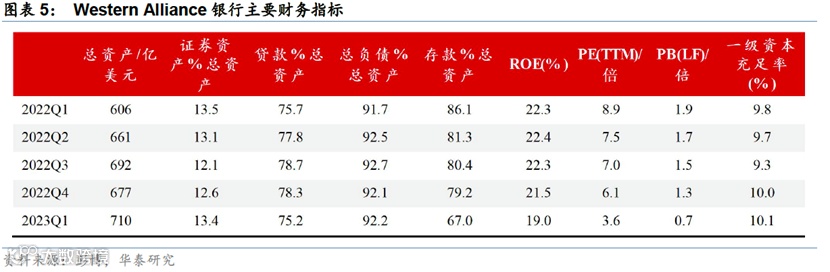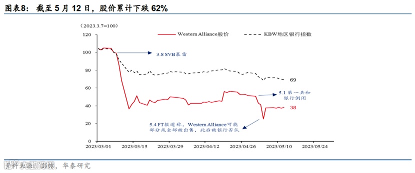 3月8日至5月12日,股价累计下跌62%。主要原因包括:1)未保险存款占比高,2022年底为52%,导致存款流失,2023Q1存款相对2022Q4下降11%。根据公司公告,截至5月9日未保险存款的占比降至21%,存款相对1季度末增加18亿美元,增长4%;2)5月4日,金融时报称,Western Alliance已经聘请财务顾问探索战略选项,将业务部分或者全部出售,导致股价一度大跌60%,但Western Alliance随后否认上述报道,股价跌幅有所收窄。3)贷款浮亏占比较高,导致总浮亏占资本之比达到75%。