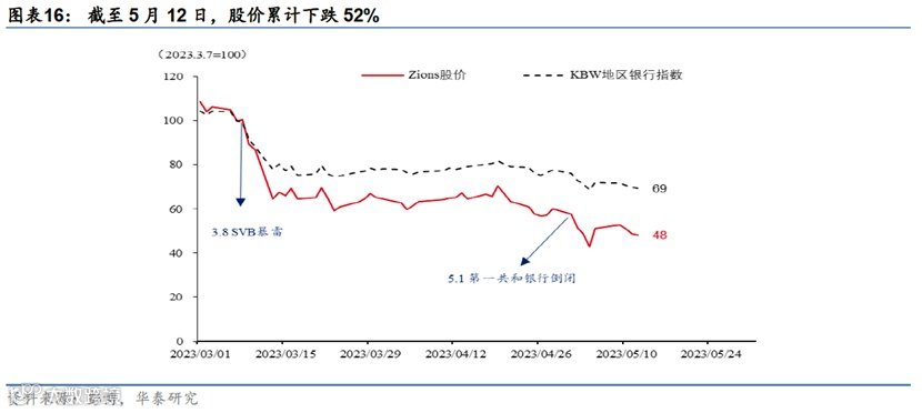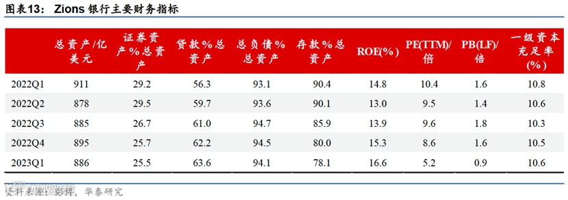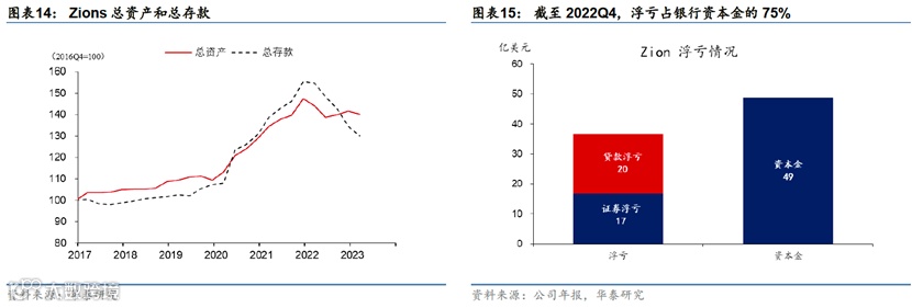 4. Zions Bancorporation Bank(齐昂银行)营业活动区域包括犹他、亚利桑那、加州等,是美国目前第19大银行,总资产886亿美元。3月8日-5月12日,股价下跌52%。主要原因包括:1)资产端“浮亏”较严重,截至2022年12月底,贷款和证券投资的浮亏达到银行资本金的75%。2)2022-2023Q1存款累计下降16%。