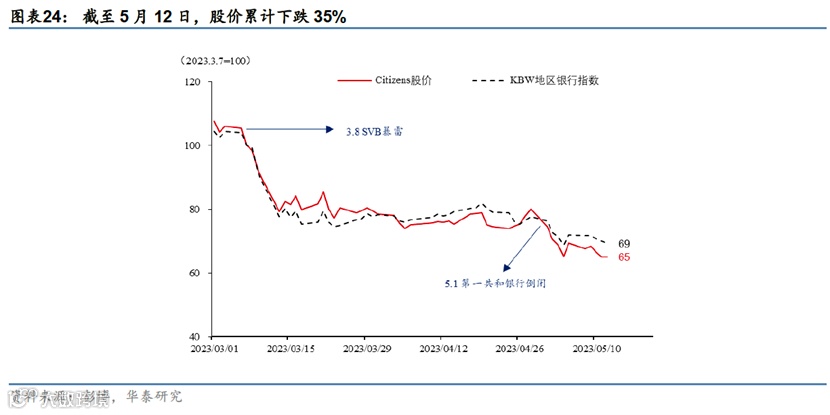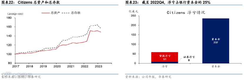 3月8日至5月12日,股价累计下跌35%,与地区银行指数的跌幅接近。2022Q4 Citizens未保险存款占比为40%,2023Q1存款相对2022Q4下降5%。根据公司公告,4月份存款还有小幅增加。截至2022年12月底,Citizens贷款和证券投资的浮亏占银行资本金的25%。