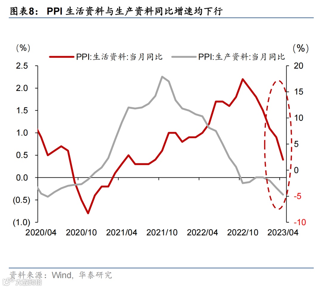 生产资料价格同比下降4.7%,拖累PPI约3.7个百分点;而生活资料价格同比上涨0.4%,提振PPI约0.1个百分点。其中,食品、衣着及一般日用品同比小幅上涨0.4%-2%,但耐用消费品价格下降0.6%(图表8)。