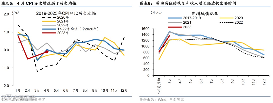 环比而言,4月CPI环比-0.1%略低于环比历史均值0%,核心CPI环比较3月的0%略回升至0.1%,但仍低于历史均值(0.25%),显示内需回升动能偏弱(图表5)。如我们在《1季度GDP数据发布后的5点思考》(2023/4/20)中分析,1季度居民可支配收入增长从去年4季度的2%回升至1季度的3.8%,但增长低于5%的名义GDP增长,1季度新增城镇就业较20/22年同期偏强,但仍弱于疫情前/2021年水平,显示劳动力在疫情后以较快的速度返回工作岗位,但劳动岗位的恢复和收入增长爬坡仍需要时间(图表6)。