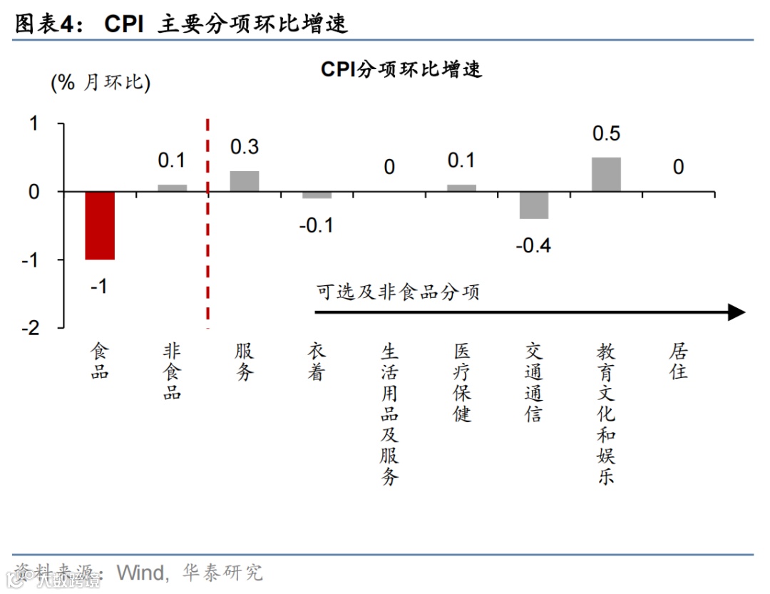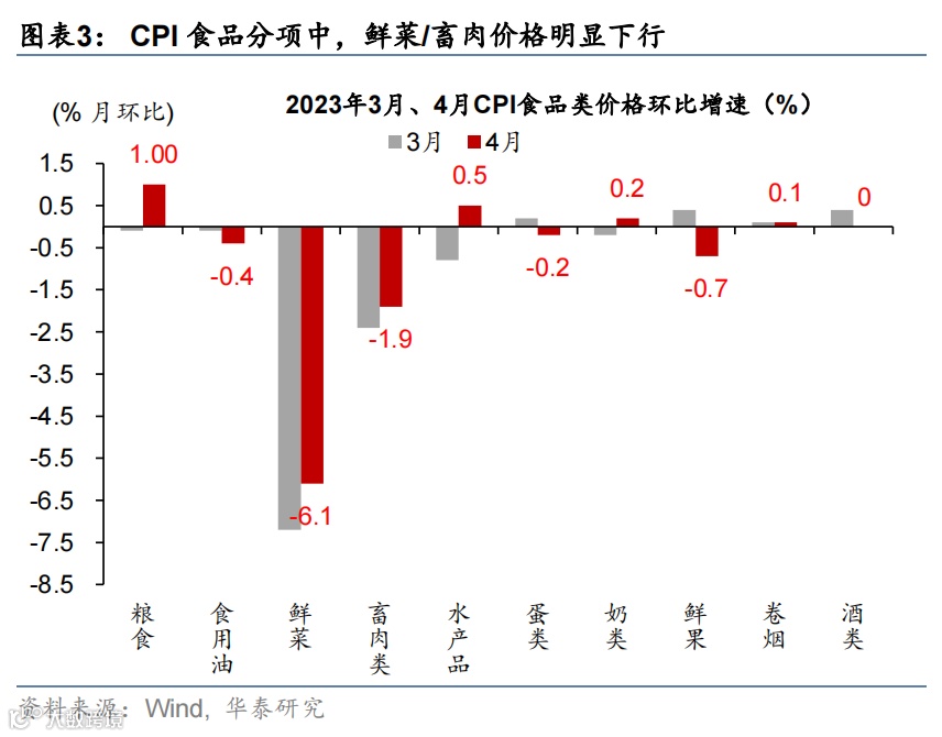 食品CPI同比从3月2.4%回落至0.4%。其中,鲜菜价格同比下滑13.5%、拖累同比约0.3个百分点,而CPI猪肉分项同比从3月9.6%下行至4%,对CPI同比贡献回落约0.1个百分点(图表3);