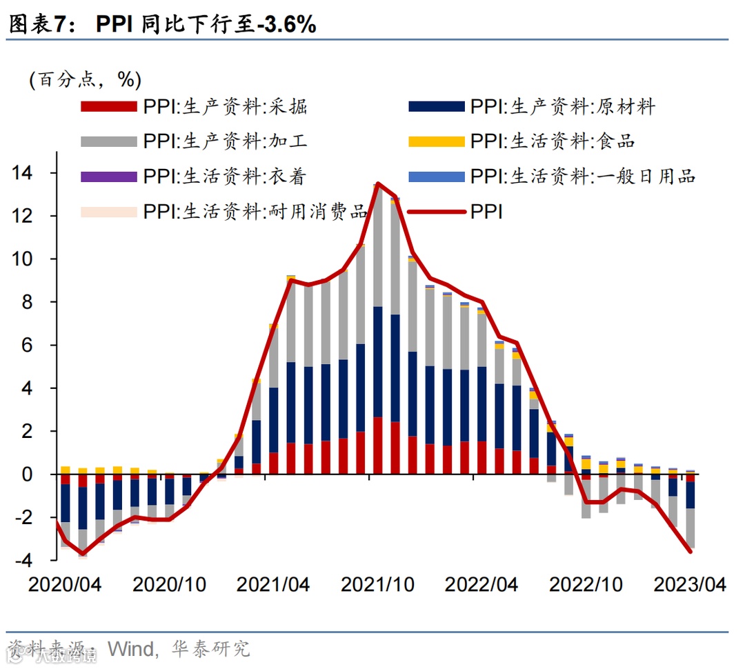 4月PPI同比增速从3月的-2.5%下行至-3.6%,去年同期石油天然气、煤炭的高基数带来较大影响——去年4月石油行业开采/加工价格同比增速高企于48.5%/38.7%,煤炭开采同比抬升至53.4%。PPI环比较3月的0%下行至-0.5%、煤炭、石油加工、黑色有色、计算机环比回落较多(图表7)。具体看: