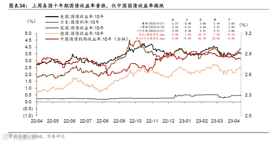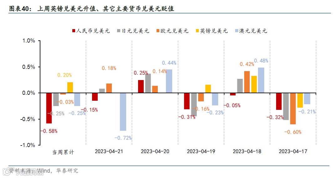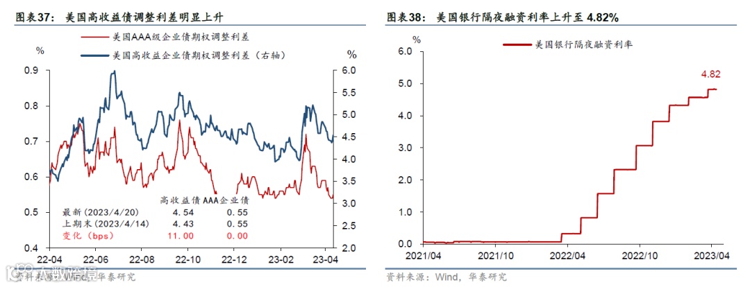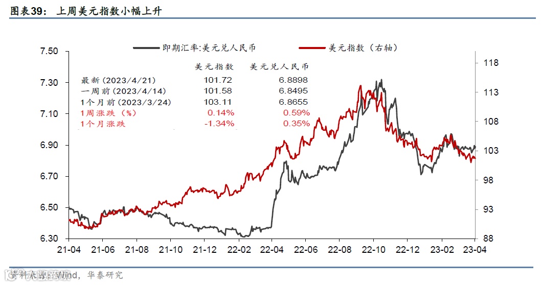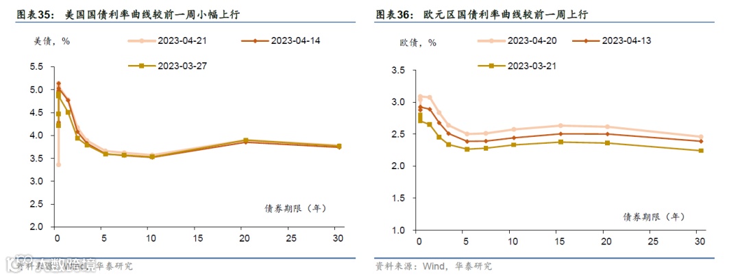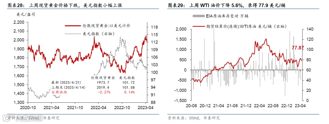 美国加息预期回升,美元指数微涨,美欧长端利率上行,能源价格大幅下跌。超预期的PMI数据导致联储加息预期上行,4月21日市场隐含的美联储5月会议加息25bp的概率从此前一周的81%上行至90%;美元指数微涨0.14%,收于101.7;美欧收益率曲线上行,其中美国2年期国债收益率维持不变,10年期国债收益率上涨5bp至3.57%。欧央行3月会议纪要总体偏鹰,刺激欧元区2年和10年期国债收益率分别上涨16bp和13bp至2.83%和2.57%。大宗商品方面,由于柴油需求疲软引发了市场对原油需求的担忧,WIT和布伦特原油环比大幅下跌5.6%和4.9%,分别收于77.9和83.7美元/桶,金属和粮食价格普遍下跌。