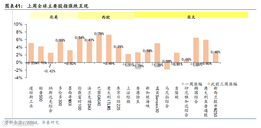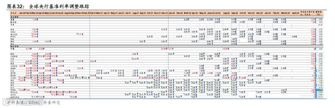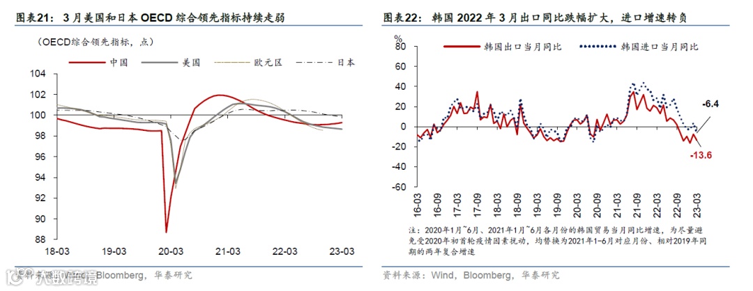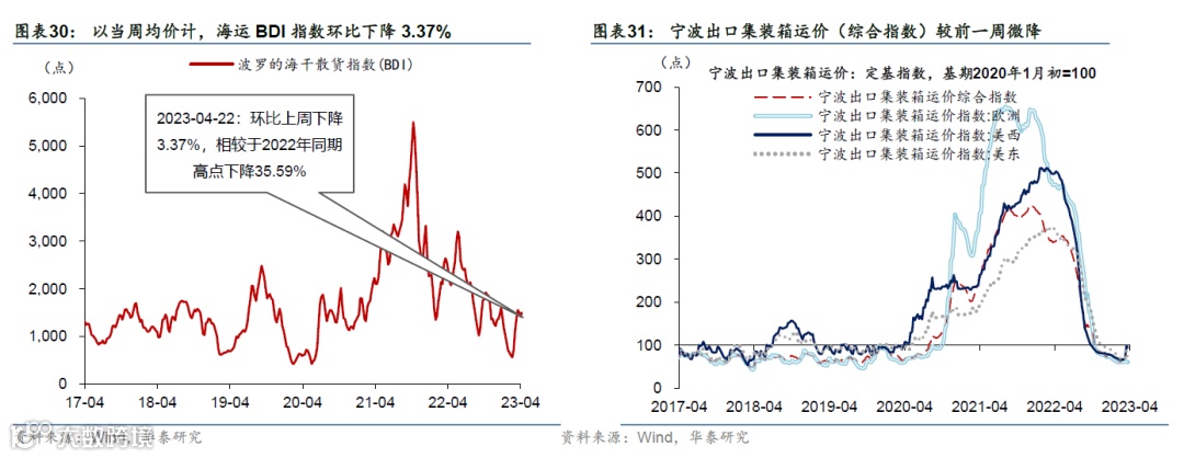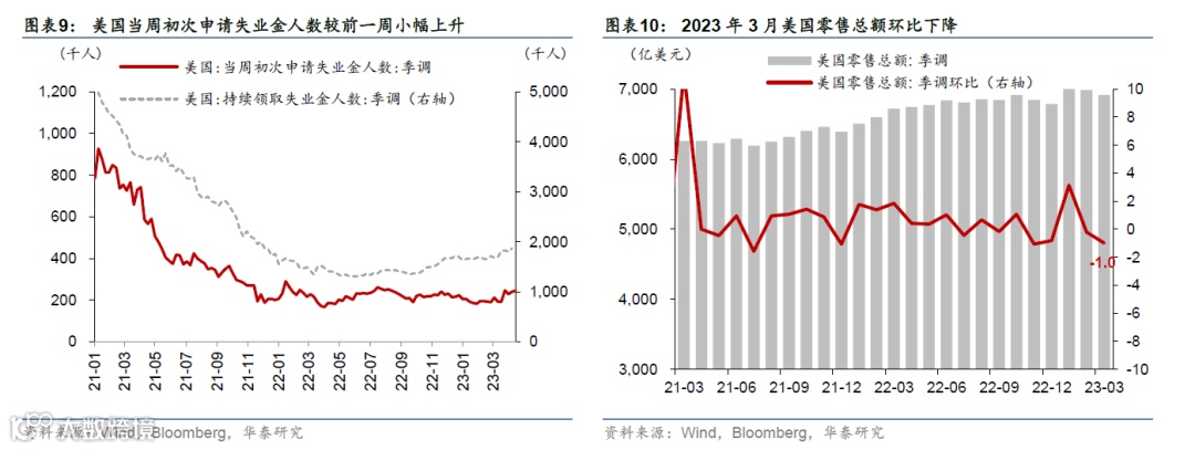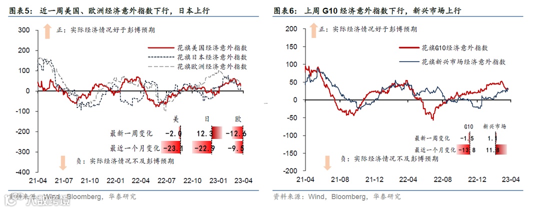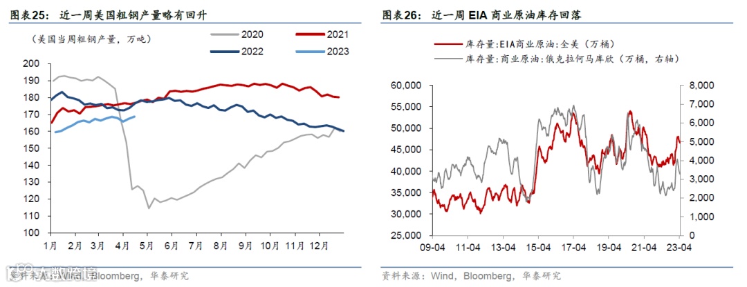 美国加息预期回升,美元指数微涨,美欧长端利率上行,能源价格大幅下跌。超预期的PMI数据导致联储加息预期上行,4月21日市场隐含的美联储5月会议加息25bp的概率从此前一周的81%上行至90%;美元指数微涨0.14%,收于101.7;美欧收益率曲线上行,其中美国2年期国债收益率维持不变,10年期国债收益率上涨5bp至3.57%。欧央行3月会议纪要总体偏鹰,刺激欧元区2年和10年期国债收益率分别上涨16bp和13bp至2.83%和2.57%。大宗商品方面,由于柴油需求疲软引发了市场对原油需求的担忧,WIT和布伦特原油环比大幅下跌5.6%和4.9%,分别收于77.9和83.7美元/桶,金属和粮食价格普遍下跌。