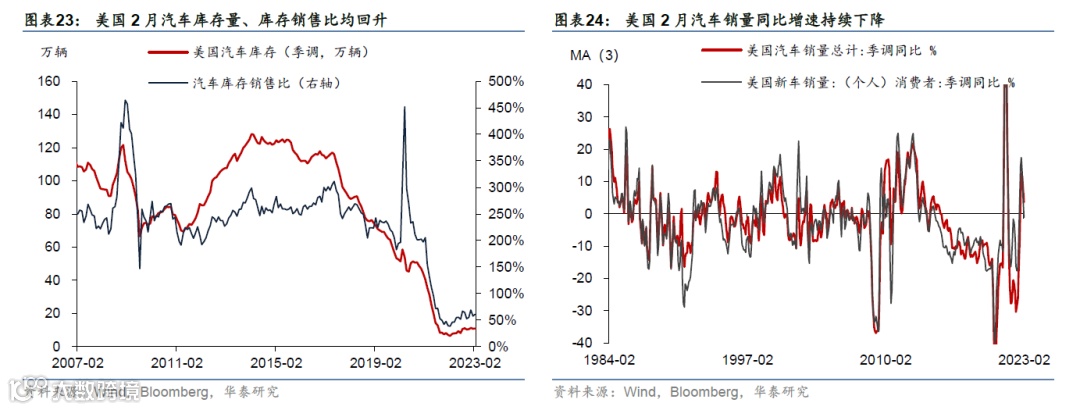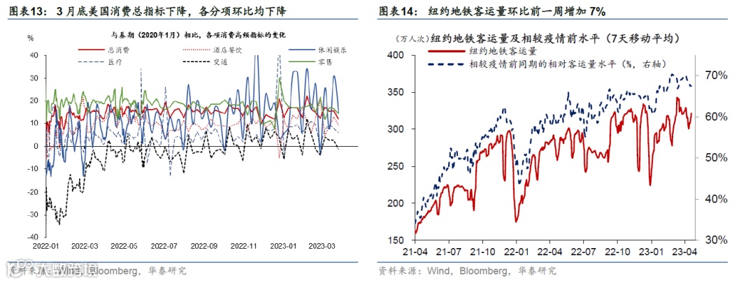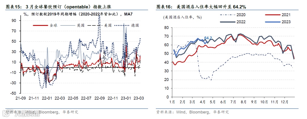 全球和美国出行活动持续升温。上周全球航班和商务航班数量持续回升,环比分别增加1.9%和3.2%。美国出行活动同步回升,TSA安检人数环比增加2%;纽约地铁客运量环比大幅增加7%。美国酒店入住率也回升2.9个百分点至64.2%,高于2022年同期水平。