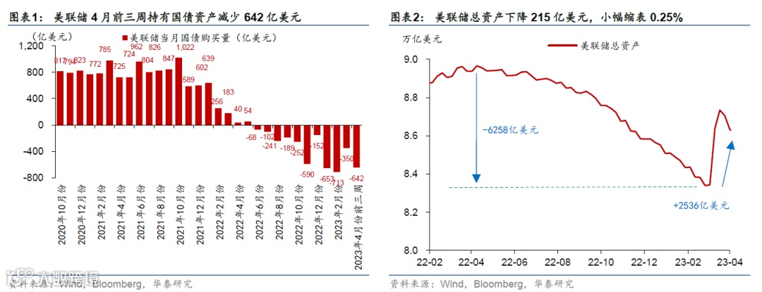 美联储总资产持续回落,但联储对金融机构的BTFP和贴现窗口贷款存量均重回升势。4月12日-4月19日美联储总资产规模连续第四周回落,降幅小幅上升至215亿美元,资产端,国债和MBS下降173亿(前一周+6亿),海外央行贷款(FIMA Repo Facility)回落100亿(前一周-100亿);对国内银行贷款则再次上升——对金融机构贴现窗口贷款上升23亿美元(前一周-21亿美元),BTFP(1年内)回升72亿美元(前一周-21亿美元),显示美国银行总体流动性风险仍在反复。负债端,4月18日美国个税申报截止,税收集中入库大幅推升TGA存款(+1785亿),其他存款减少1896亿。上周欧央行总资产变化不大,欧洲银行系统总体比较平稳;日央行周度购债规模有所上升,10年期国债收益率回升至0.48%(参见《联储BTFP和贴现窗口贷款再度上升》,2023/04/21)。