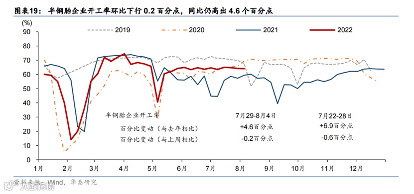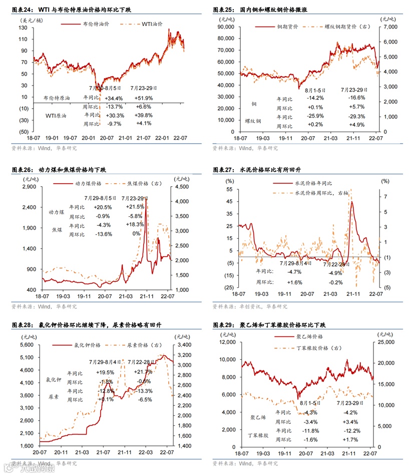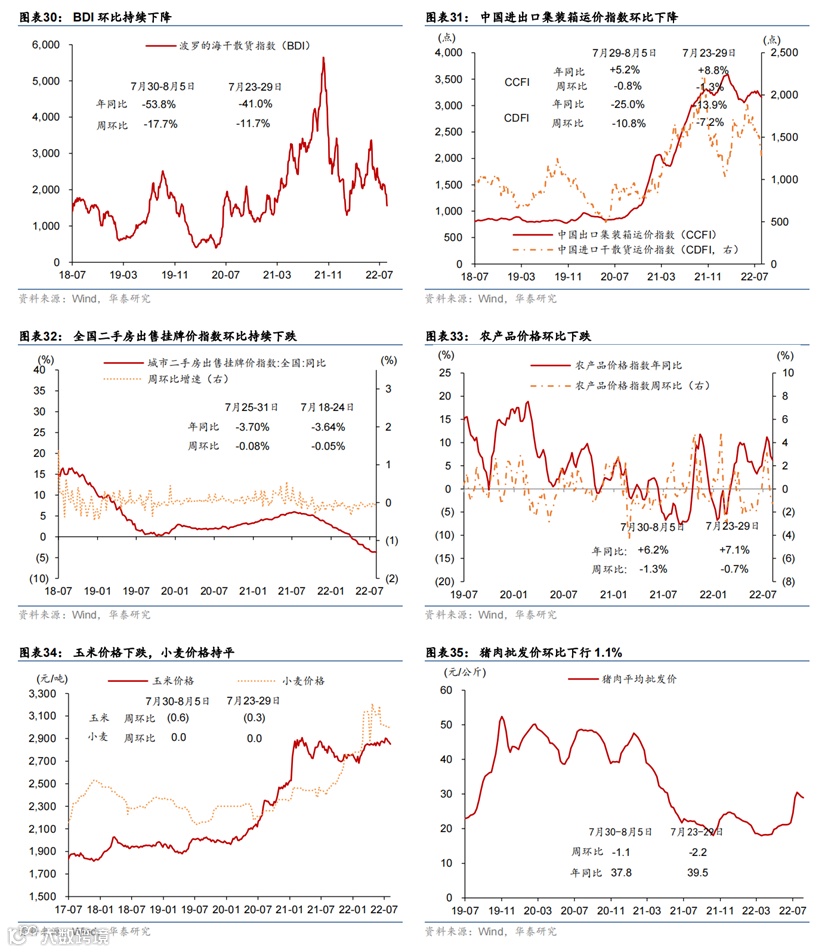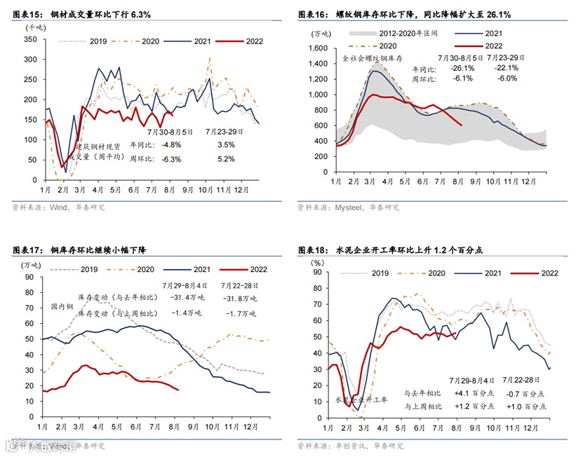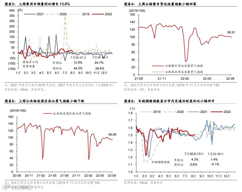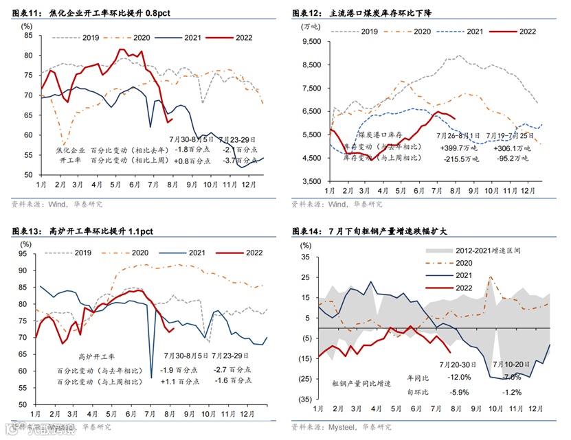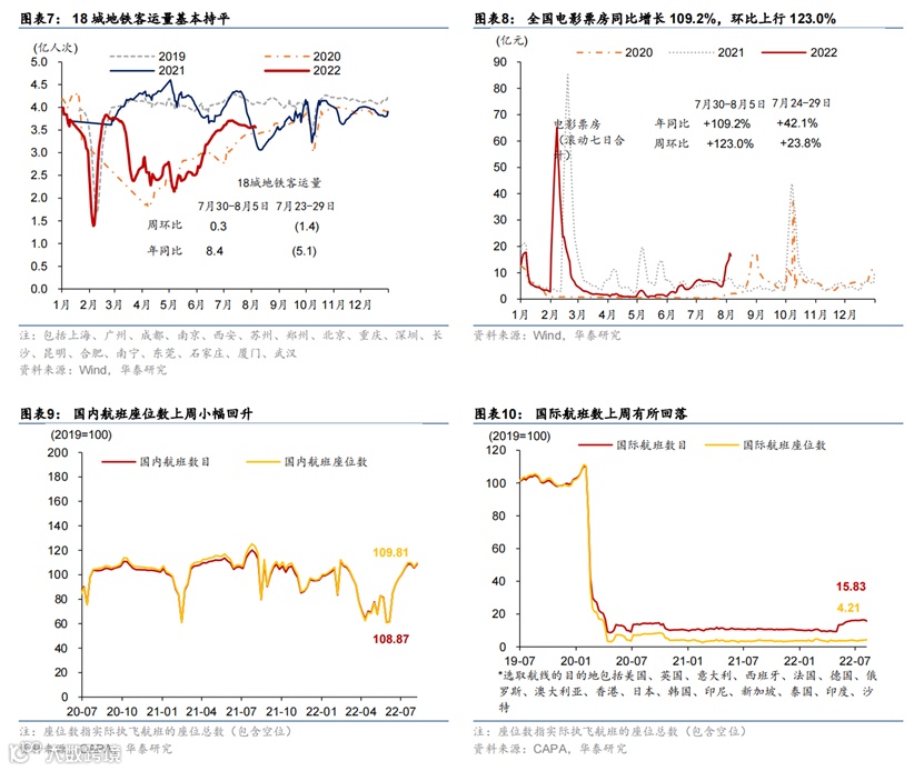 上周部分旅游城市如三亚、伊犁等地出现散点爆发疫情,可能对旅游需求造成冲击。工业生产指标普遍回升。7月30日-8月5日,全国新增本土感染者1102例,海南三亚、浙江义乌等地疫情形势较为严重,三亚市已全市实行临时性全域静态管理;截至8月6日,全国共有中/高风险地区392/804个。高频指标显示上周18城地铁客运量基本持平,百城拥堵指数及电影票房同比涨幅有所扩张,国内航班数小幅回升。7月最后一周乘用车销售同比增速从前一周的25%下行至14%,半钢胎企业开工率环比小幅下行但同比仍高于往年。上周物流园区吞吐指数环比小幅下行1.1%,整车物流指数环比下行2.1%。另一方面,工业生产指标加速,上周焦化/高炉企业开工率分别上行0.8/1.1个百分点,水泥开工率上行1.2个百分点,主流港口煤炭库存继续下行,但钢材成交量环比下行6.3%。地产方面,上周30城商品房成交面积同比跌幅继续收缩至9.6%,同时土地成交同比录得22.1%。