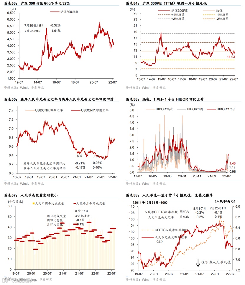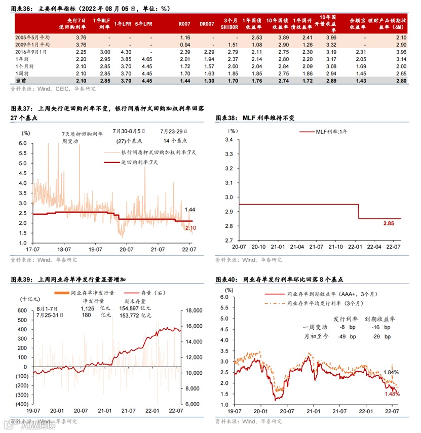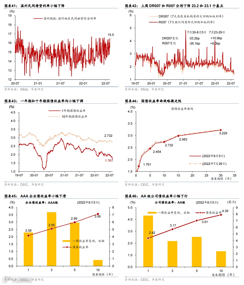 短期流动性进一步宽松,但房地产融资继续走弱。上周银行间利率低位下行,R007下行26bp至1.44%,DR007下行33bp至1.3%,同业存单发行利率同样下行。债券市场杠杆上升。国债收益率曲线陡峭化,一年期国债收益率为1.84%,但企业债收益率曲线总体上移、信用利差扩大,尤其是房地产企业发行利率攀升。融资规模方面,信用债、海外债融资额有所回升,但股票融资和境内房地产债融资均走弱。上周利率债发行同比多增22.6%。上周人民币对美元汇率小幅贬值0.2%,兑一篮子汇率贬值0.2%。