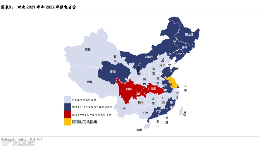由于本次电力紧张的短期触发因素是极端天气,而非政策对排放指标的严格管理,所以,随着气温下降,短期用电紧张有望缓解。对比去年,“双限”对工业生产的冲击十分显著,且延续时间长达2-3个月。从影响范围看,本次电力紧主要影响长江流域的川渝、湖北、江苏等省市,明显小于2021年“双限”期间电力消费受限区域。