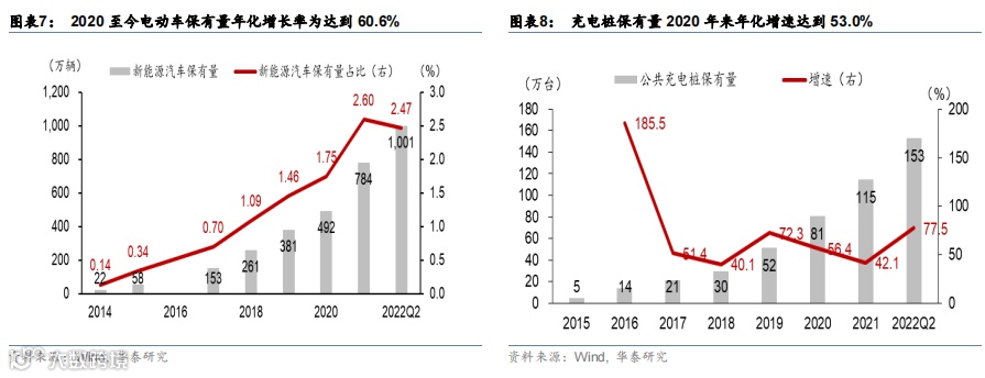 近年来高速发展的一些新兴成长性行业,比如数据中心、电动车等,虽然不属于传统制造业中的高耗能产业,但是这些行业带来的间接能耗仍不可忽视。以电动车为例,中国电动车保有量从2014年的22万辆增长46倍、至2022Q2的1001万辆, 2020至今的年化增长率为 60.6%,2021至2022Q2进一步加速,增速达到为63.0%。即便如此,电动车保有量还有大量的上升空间(图表7)。此外,随着电动车的普及率提升,充电桩保有量也随之保持高速增长,2020至2022Q2年化增速为53.0%,2021至2022Q2年化高达77.5%(图表8)。2020年至今,国际油价大幅上涨了46.5%,而中国的居民电价几乎保持不变,油电价格比的“倒挂”带来实际意义上的“套利”空间,也在一定程度上助推了电力需求的增长。